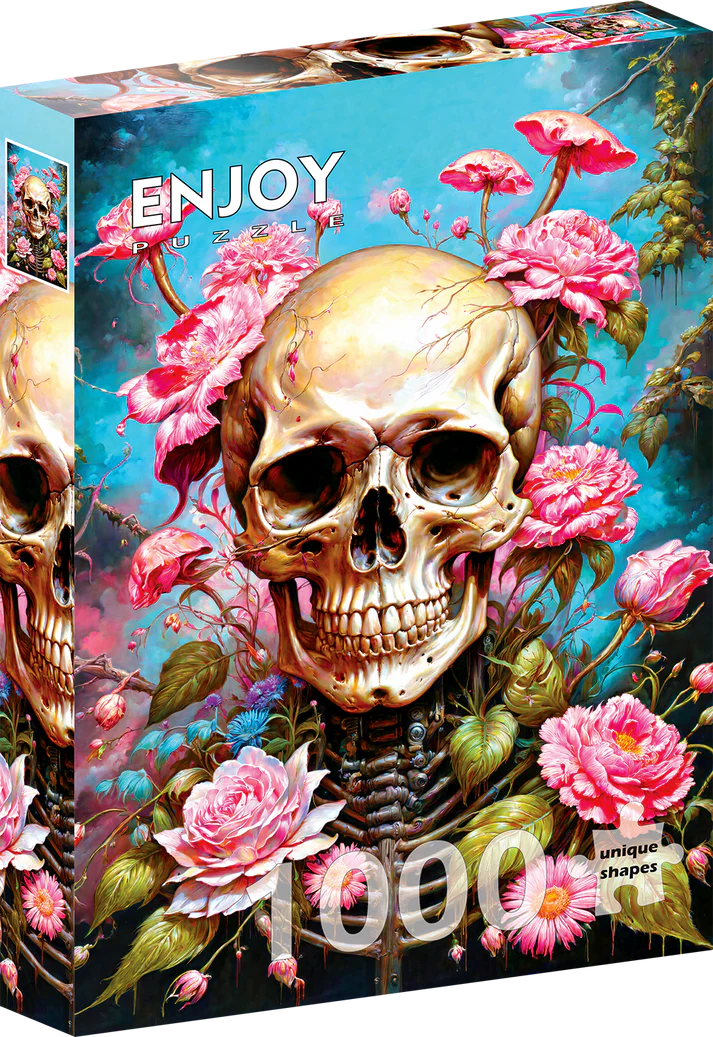 A skeleton rests as delicate pink flowers weave through its bones, reaching skyward in a mesmerizing dance of life and renewal. This surreal symphony of beauty and decay reminds us that even in the quietest places, life finds a way to bloom.