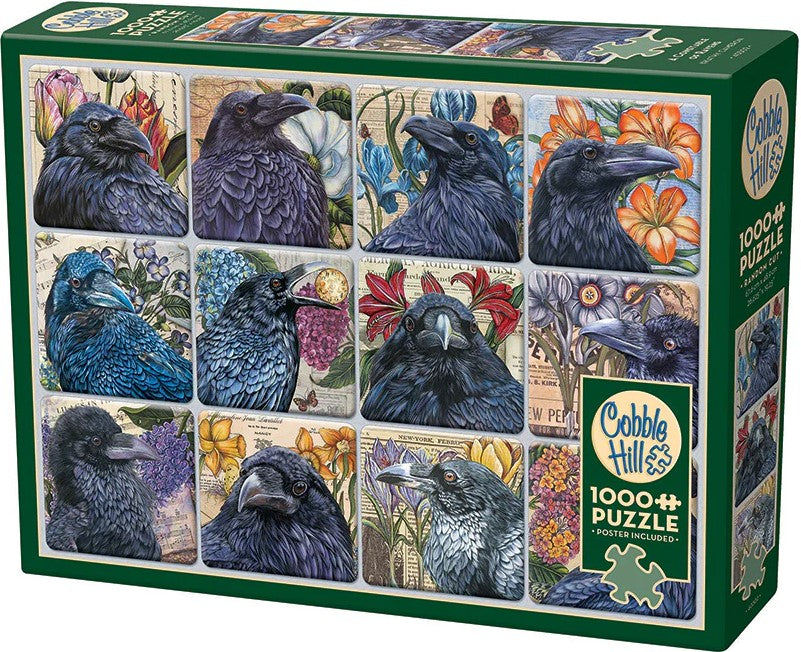 Be entranced by the enigmatic charm of A Constable of Ravens. This 1000 piece puzzle by Kathy Cameron features a dozen ravens adorned with colourful florals, revealing their unique poses and personalities. Admire the sophistication and beauty of these mysterious birds.