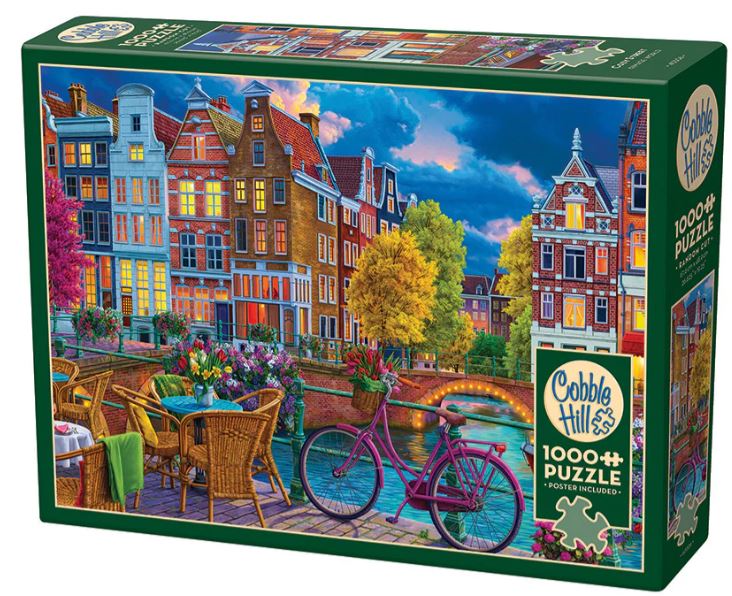 The sun may have set, but the glow of the lights on this Cozy Street creates a warm vibe, setting the tone for a perfect evening dinner outdoors. This 1000 piece puzzle captures the casual atmosphere of a picturesque European village. A pink bicycle leans against the canal rails, its basket overflowing with vibrant red flowers. The tables are set, each with a thoughtful blanket ready for a gentle breeze. The calm water reflects the serene beauty of the scene, as a nearby boat waits to take passengers on a scenic tour through the charming canals.
