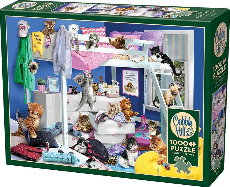 Prepare for cuteness overload with "Kitten Slumber Party"! Count the many playful kittens as they hang from blankets, spill out of drawers, pop out of housecoat pockets, leap up ladders, love on a laptop and lounge about watching each other. This 1000 piece puzzle by Robert Giordano transforms a girl's untidy room into a fun-filled feline playground. A purr-fect puzzle for any cat lover.