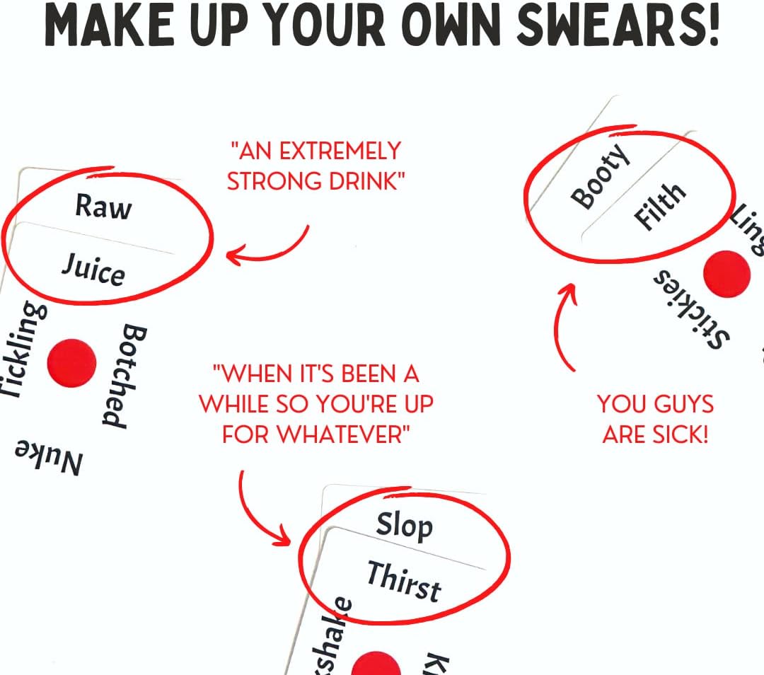 CREATE YOUR OWN SWEARS: Combine hundreds of dirty words to create hilarious new swears and slang terms that will leave everyone in stitches. Simple and naughty.