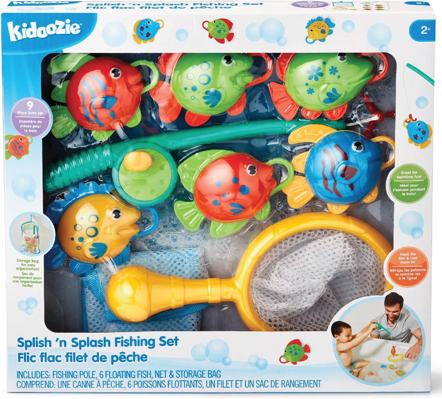 Cast your pole or use the net to catch one of the 6 floating fish! Includes: fishing pole, 6 floating fish, net and mesh storage bag. When bathtime is done, put it all away in the mesh storage bag till the next time!