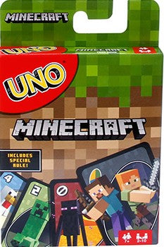As in the UNO® you love, UNO® Minecraft gameplay involves players racing to get rid of all their cards, but this version features cards with Minecraft characters and images and a special rule! And in UNO® Minecraft, there's also a new type of action card; when you draw the Creeper card, show it to the other players and they'll have to draw three more cards! You want to match a card in your hand with the current card shown on top of the deck, and you'll score points for the cards your opponents are left holding. The first player to reach 500 points wins. When you're down to one card, don't forget to yell "UNO!"
