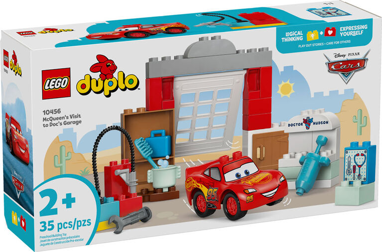 Zoom into Radiator Springs with the LEGO DUPLO Disney and Pixar Cars McQueen's Visit to Doc's Garage (10456). This interactive building set puts preschoolers ages 2 and up in the middle of the action, caring for Lightning McQueen and making sure he's in tip-top shape for his next race. Little car enthusiasts will love helping their favorite speedster with a complete tune-up. This detailed pretend playset features a buildable Lightning McQueen car, a garage with swinging door, a hinged cabinet, and a car wash with flexible water hose to "rinse away" race-day dirt. Young mechanics can use the included wrench to give McQueen the perfect tune-up before he hits the road! This sensory-rich toy helps toddlers develop fine motor skills as they open and close doors, clip and unclip the hose, and maneuver McQueen through the garage. Perfect for independent playtime or practicing skills together, this Cars-themed building toy encourages nurturing behaviors as little ones take responsibility for caring for their favorite race car. Makes an exciting learning gift for toddlers who love car toys. Contains 35 pieces.