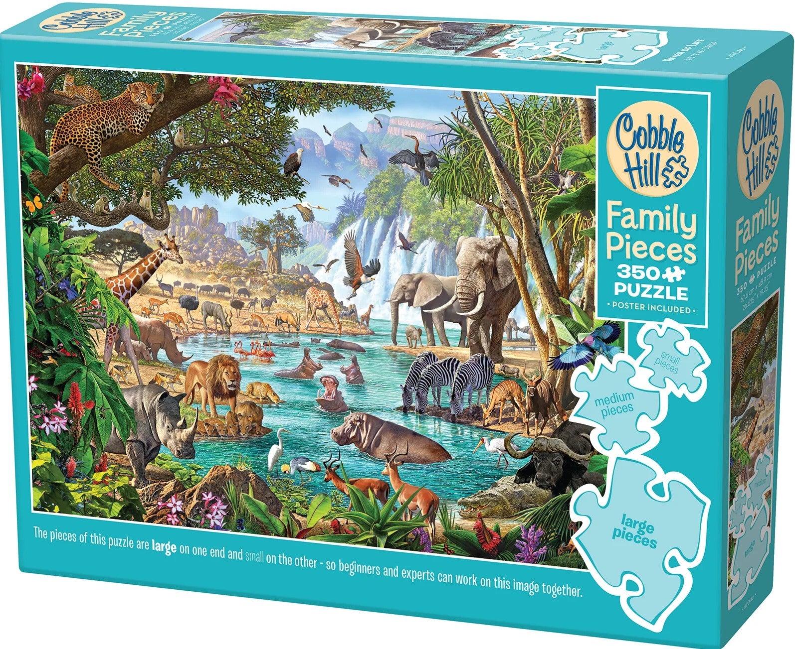 Family Pieces 350 puzzles include three different piece sizes so puzzlers of all skill levels can collaborate. The large pieces are on one end of the puzzle, the medium in the middle, and the small pieces on the other end. While these puzzles are designed for families, don't let that stop you from enjoying it on your own! It's also a great option for newer puzzlers who want to step up from a 275 piece puzzle, but not ready to jump into a 500 or 1000 piece. As well, skilled puzzlers enjoy this piece count when they need a little snack break.