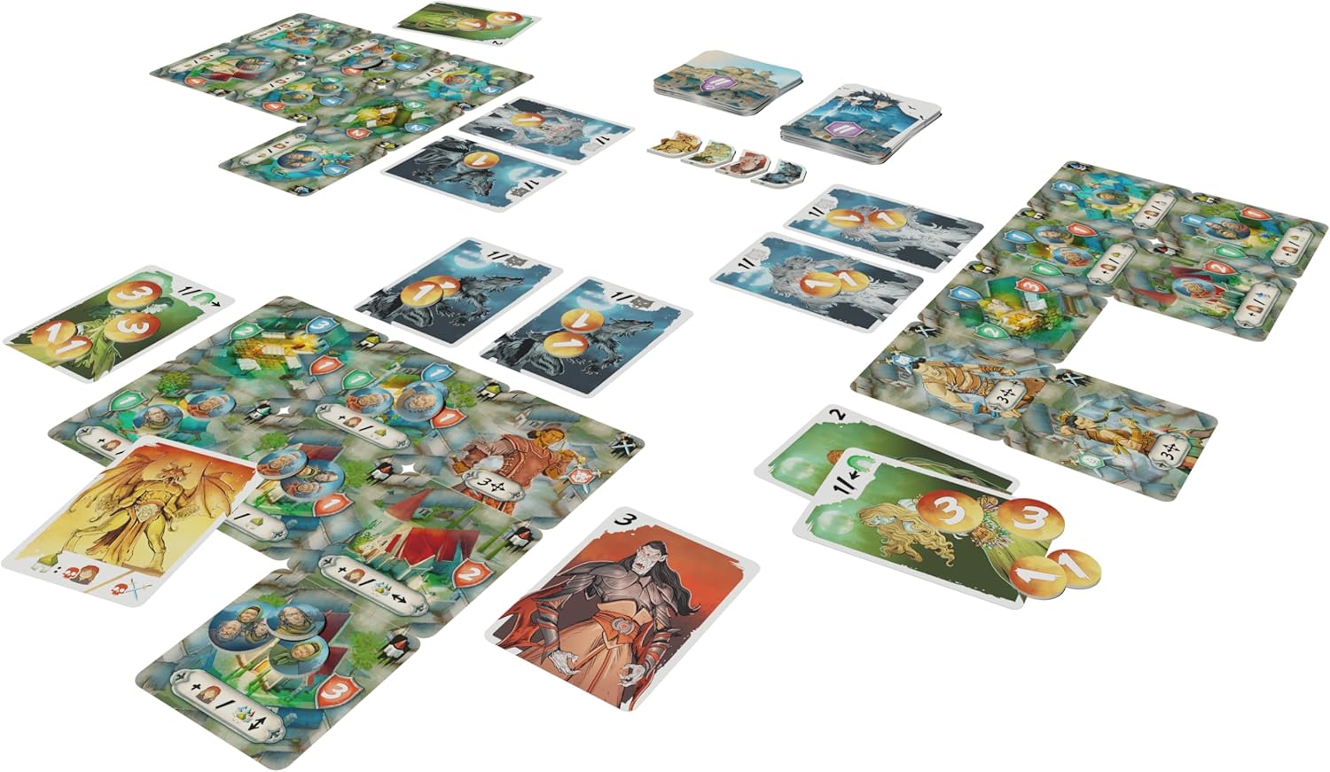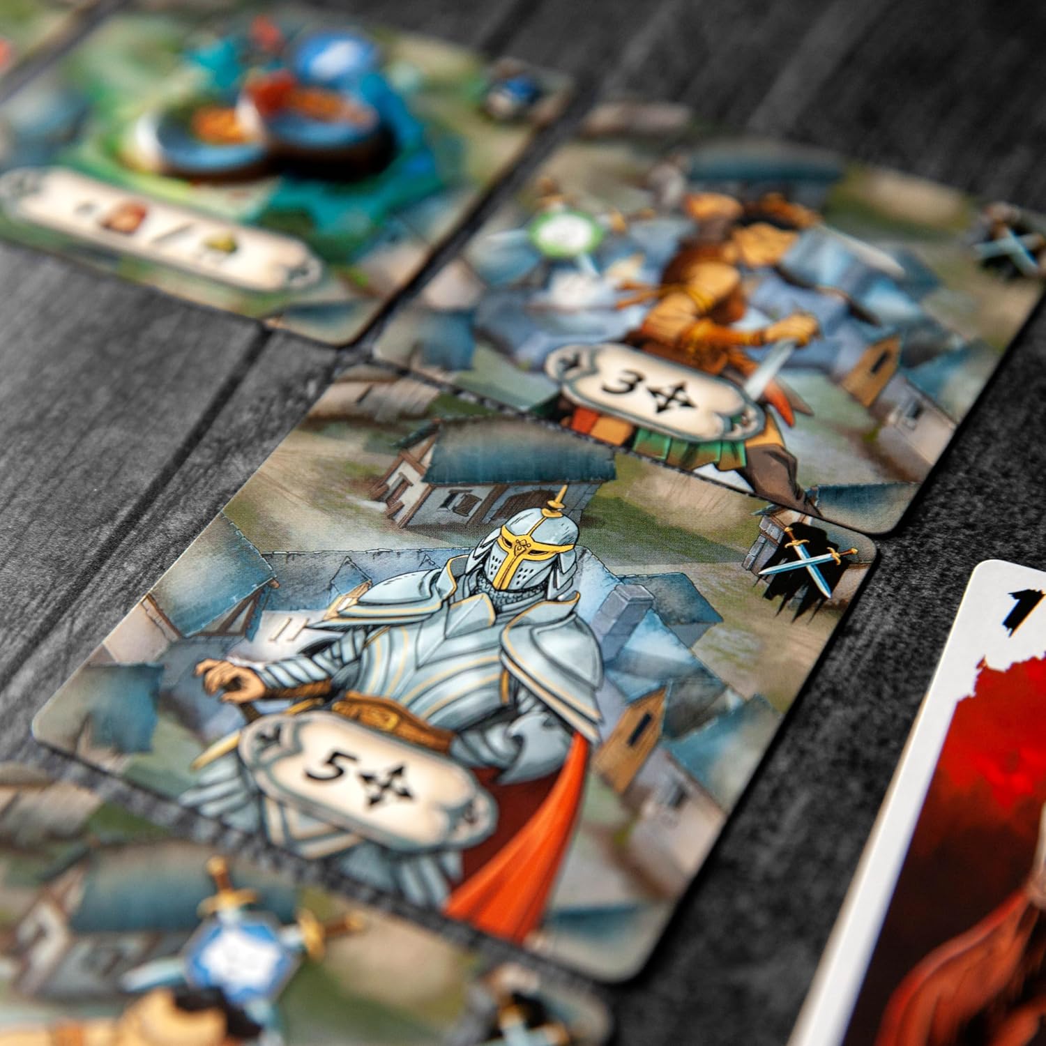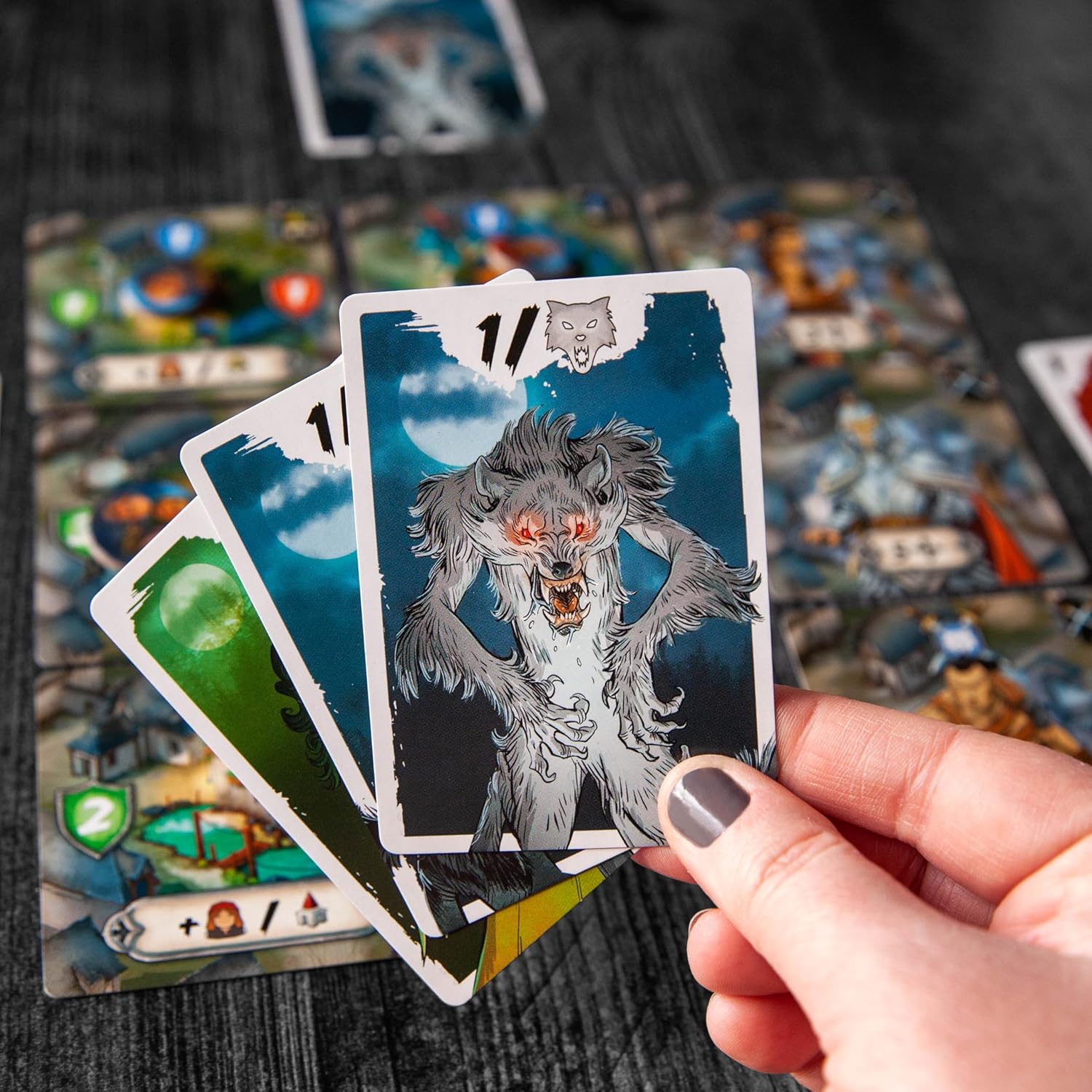 The game consists of two rounds, each with distinct phases. During the day, each player selects cards to build their village, considering the best combination of buildings, the optimal positioning and also recruit powerful heroes to protect their villagers. During the night, they receive Creature cards to split between themselves and their neighbors In the best of cases, they choose to keep creatures that their defense can handle while hitting the weakest spots in your neighbor's defenses! Finally, the Creatures attack and destroy the most exposed buildings and villagers. At the end, the player with the most surviving villagers and tamed creatures mastered is declared the winner!