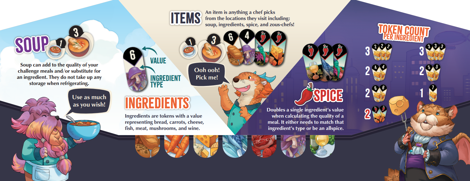 Each round new random ingredients are placed in various locations throughout the city. Players simultaneously and secretly plan which locations to send their three chefs to, hoping to collect the best ingredients. Some chefs are fast, but can only gather one item, while others can carry three items, but arrive late. Rumors are also available at locations and provide guidance on what the critic desires.