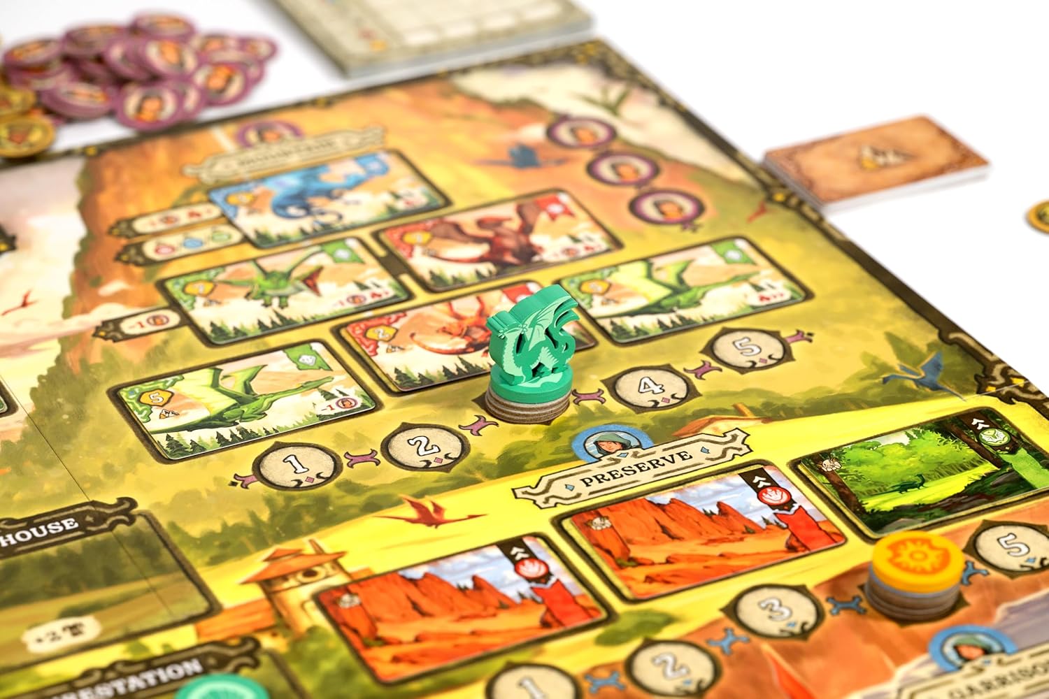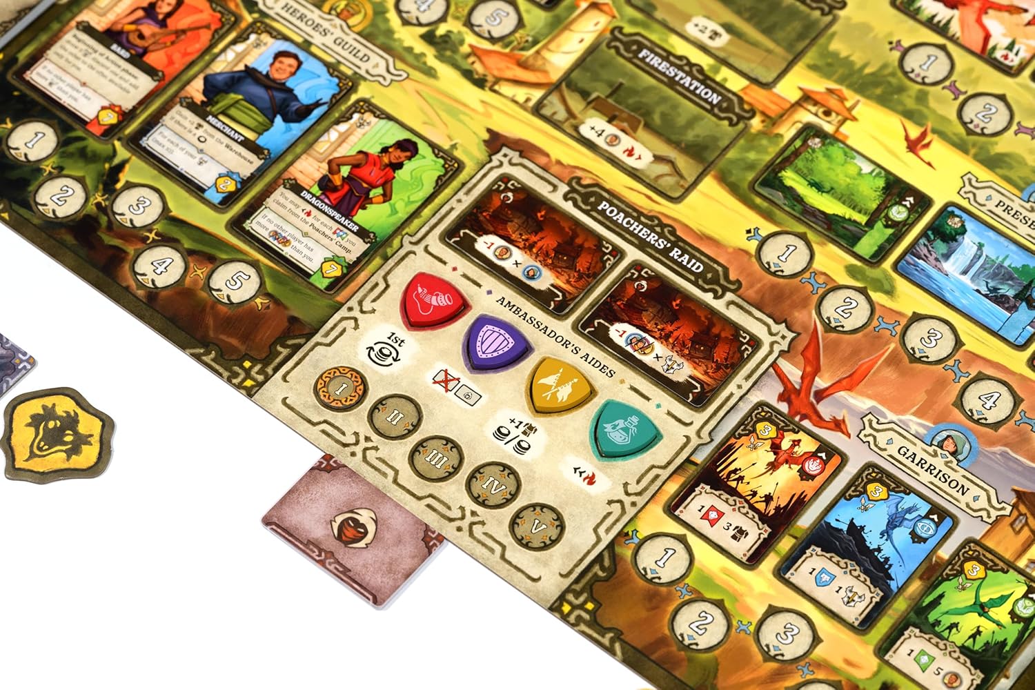 The locations’ rewards allow you to recruit Heroes with unique abilities, rescue Dragons from the poachers’ grasp to get them to safety in matching Preserves, and launch counterattacks against the poachers. In the heat of some actions, and during the Poachers’ Raid at the end of each round, you may get burned, and advancing too far on the Flame track will take its toll at the end of the game.