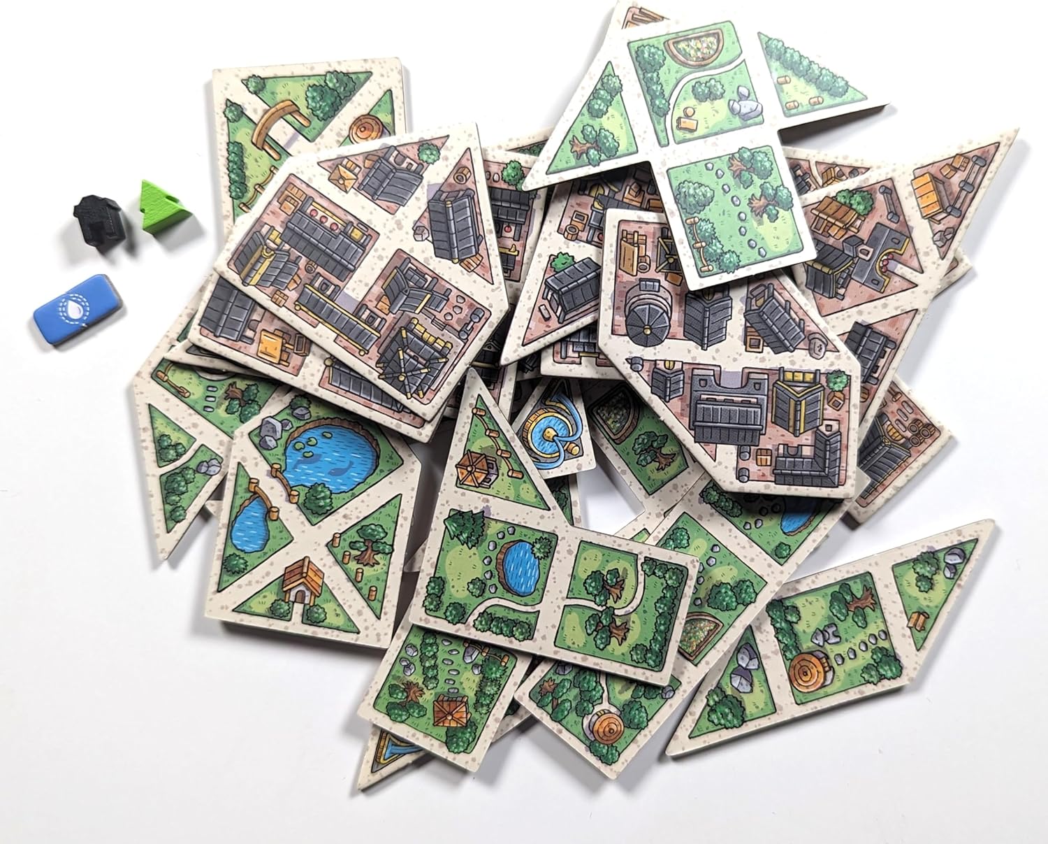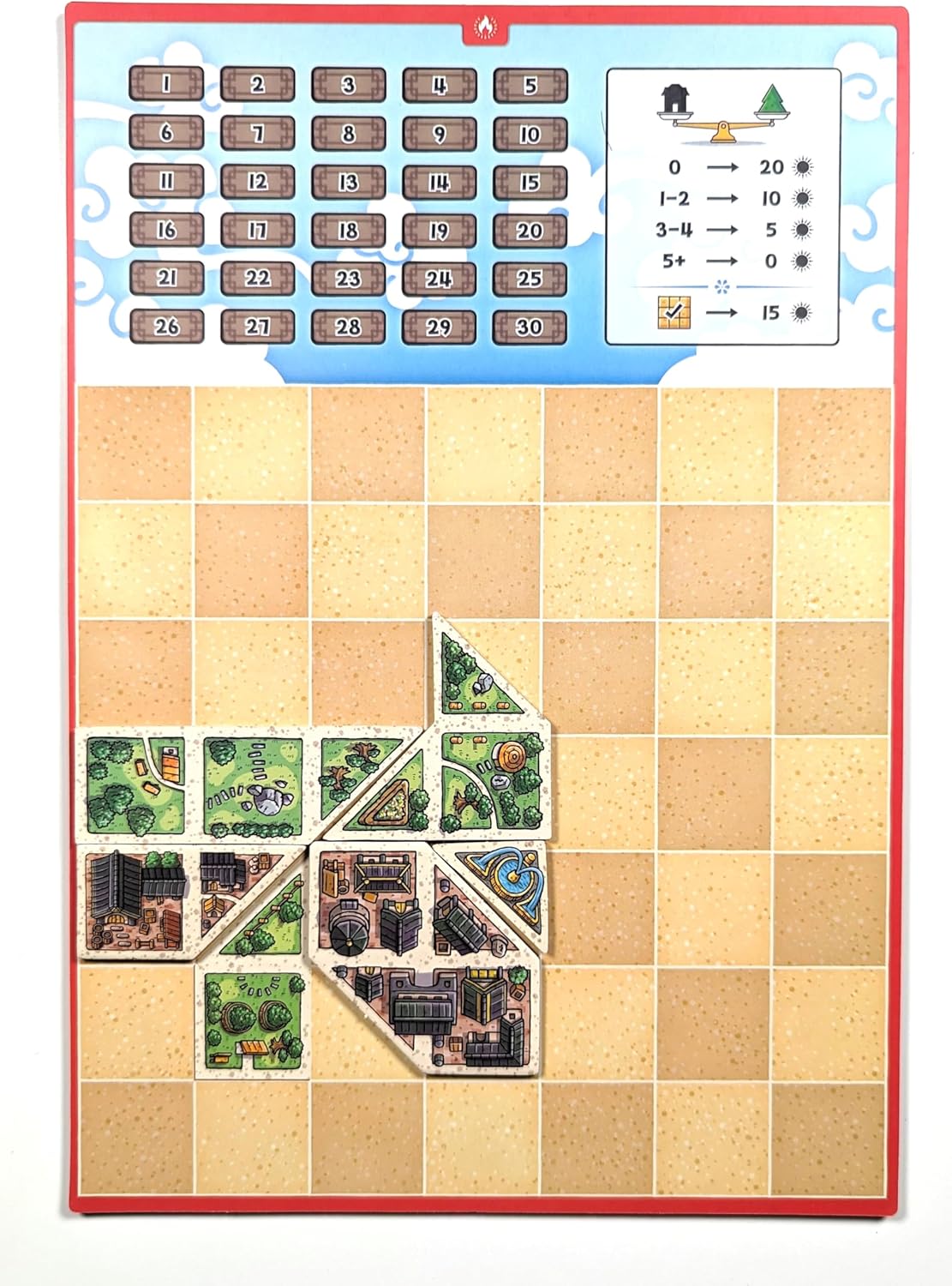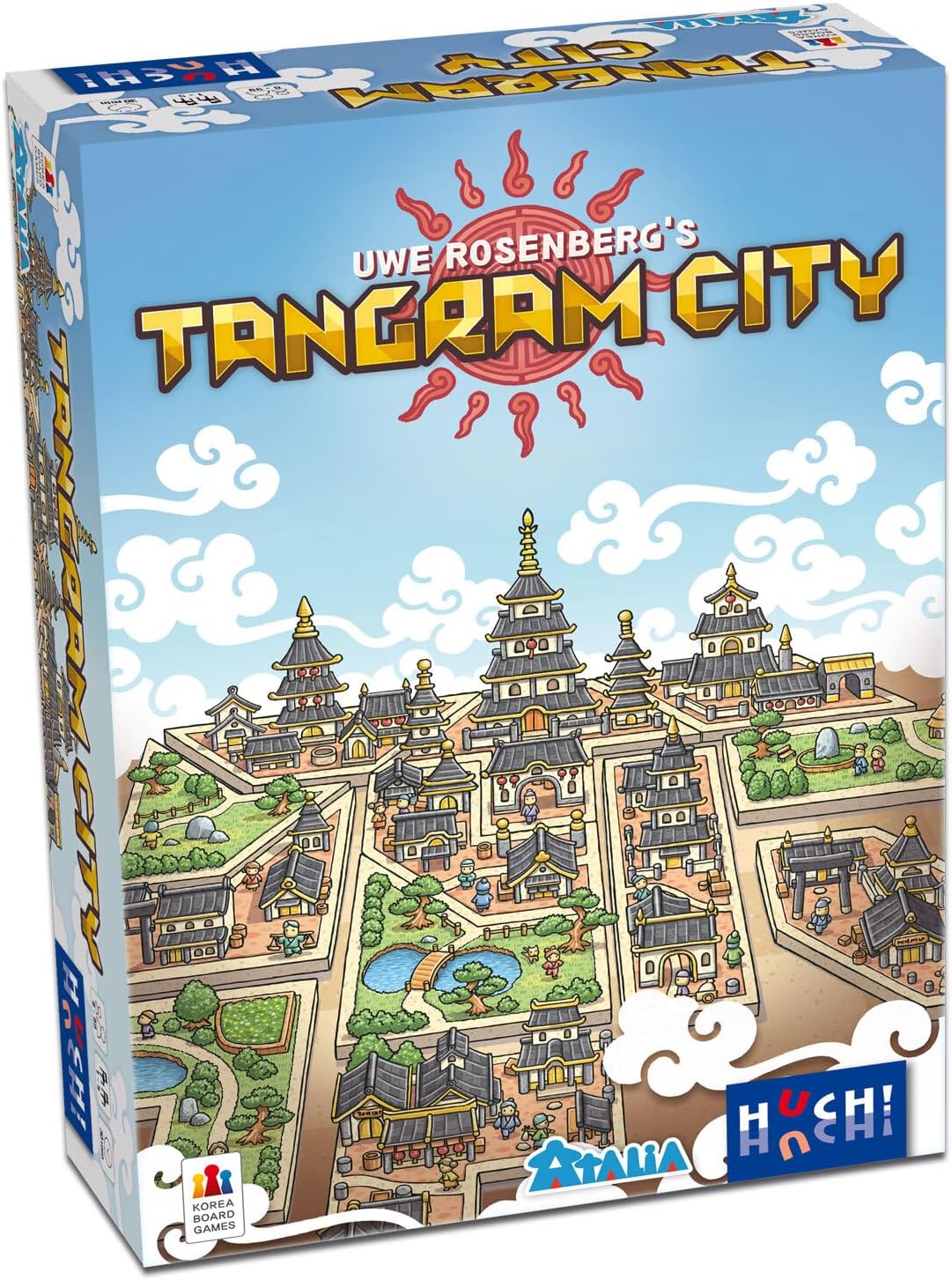 In Tangram City, players place tangram-shaped tiles in a randomly determined order in a square field while trying to balance the amount of building (black) and park (green) tiles. The more balanced these are and the more often you have built a rectangle shape, the more bonus points players receive.
