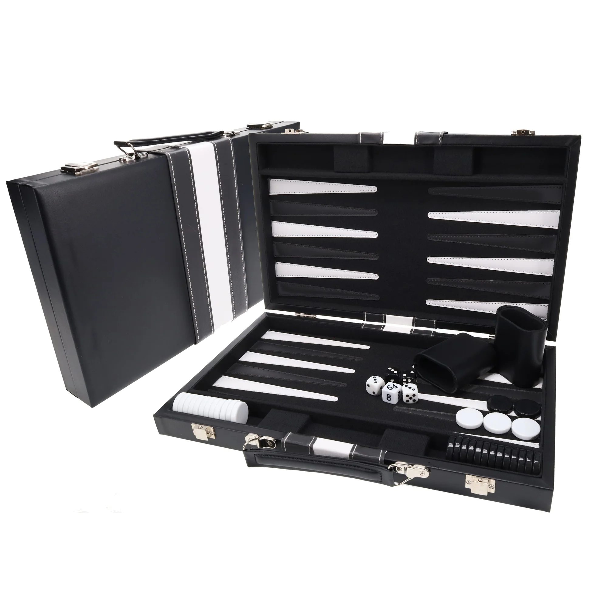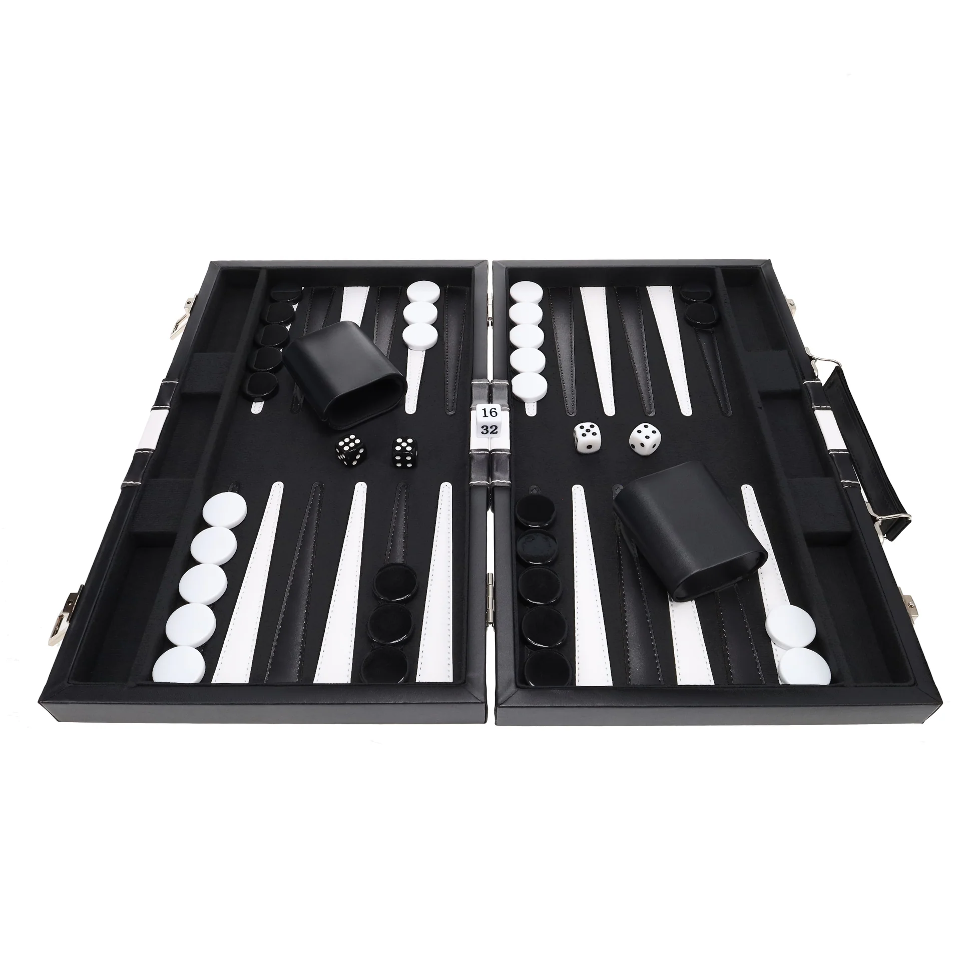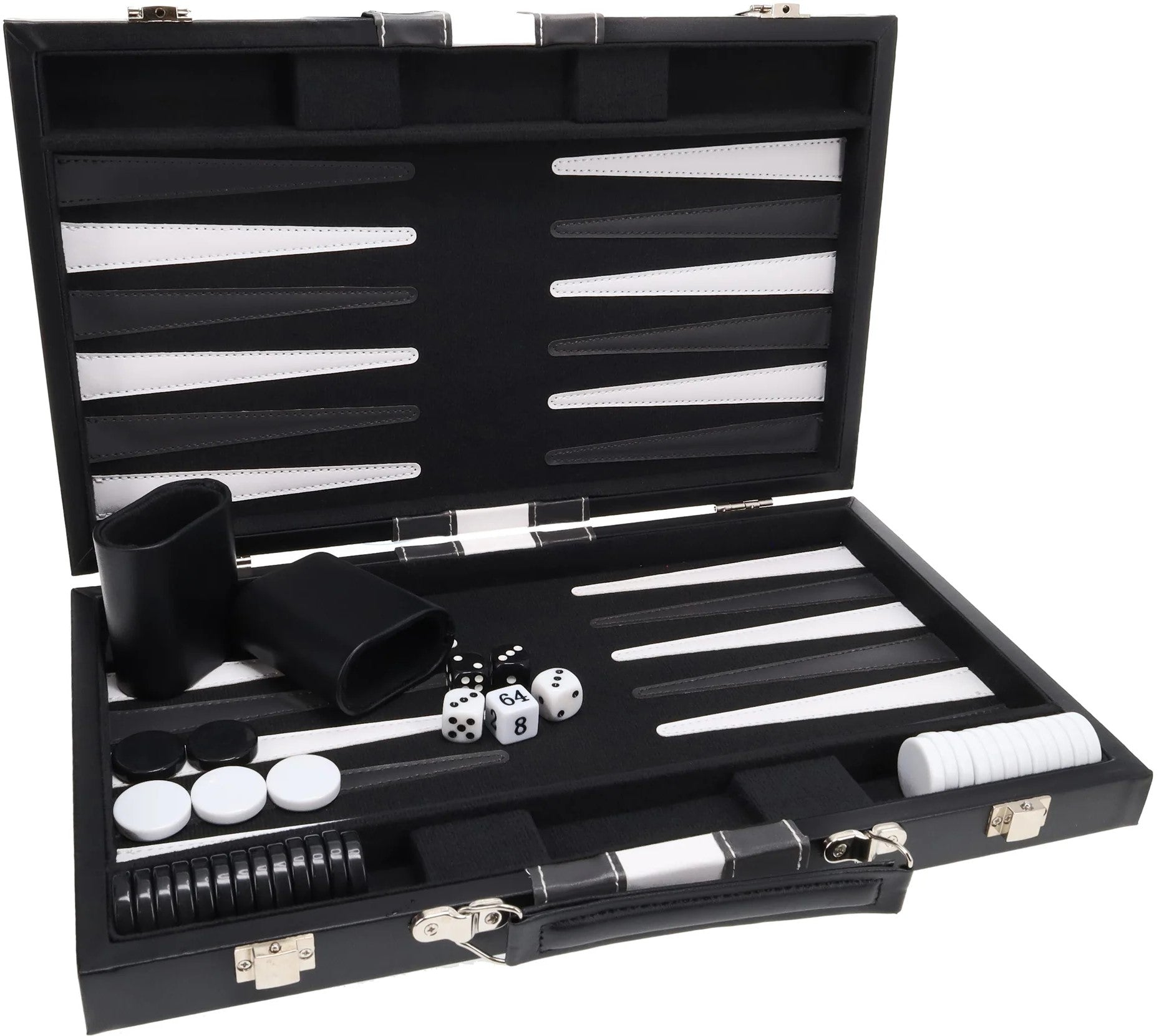 A handsome 15 inch backgammon set in a stylish black leatherette case with white stitching and horse shoe latches that contains everything you need for a challenging game of backgammon. The sturdy and intricate construction of this set is what sets it apart from others. The playing field is a soft velvety fabric with leatherette points sewn onto the surface. The set includes 30 backgammon chips in two different colors, 2 felt lined dice cups, 4 dice in two different colors, and 1 doubling cube. The dice cups are leatherette and are felt-lined to keep the dice rolling noise to a minimum. All the games pieces fit nicely within the game case for easy storage when traveling. This is a handsome addition to your game collection. It is up to you to bring the strategy!