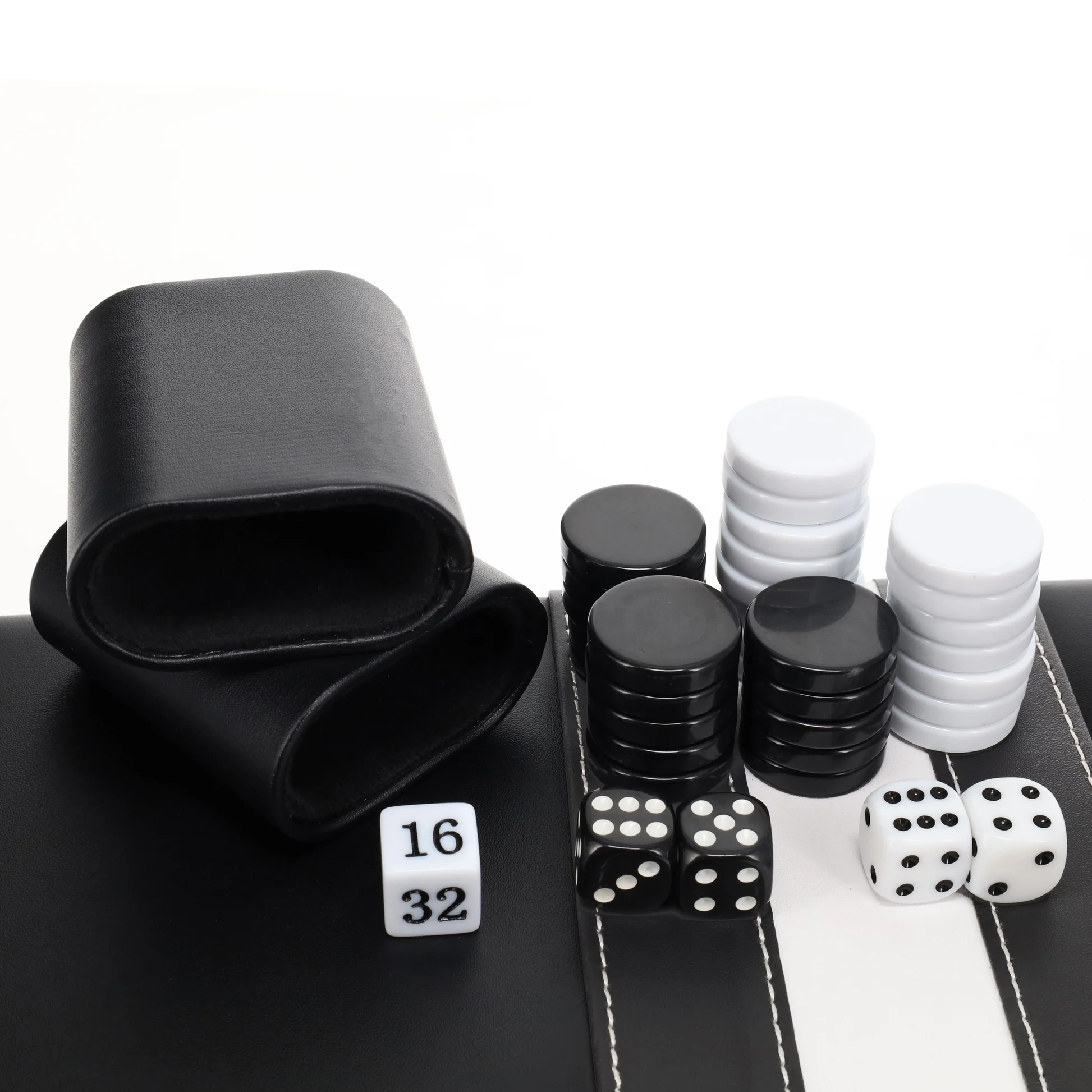 BACKGAMMON BOARD GAME INCLUDES: Game instructions booklet, 2 black leatherette dice cups with felt interior, 30 backgammon pieces and 4 dice in black and cream, and 1 doubling cube. 2 Player Games