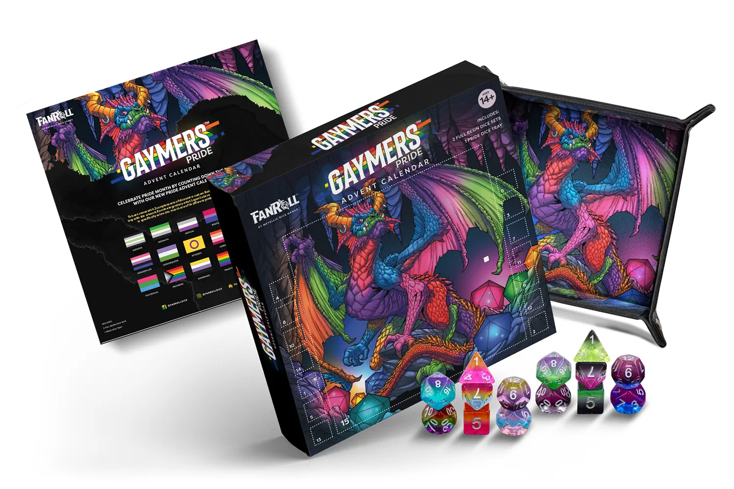This set comes with two complete dice sets and custom Rainbow Dragon artwork from the legendary comic artist Logan Lubera. Each die in the set is specifically colored to match one of 14 different pride flag colors.