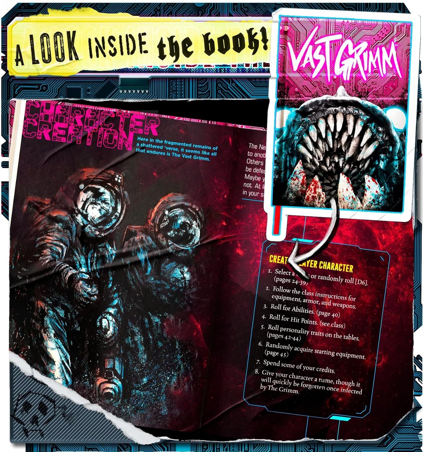 8 Fast & Easy Steps to Character Creation – Rolling dice to determine everything about your character sure makes it feel like they will not live long. This includes 8 character classes like the MAnchiNe, Emo|Bot, and The Harvester. It also has charts for Irritating Idiosyncrasies, Misspent Youth, and Battle Scars to really give your character that extra level of filth.
