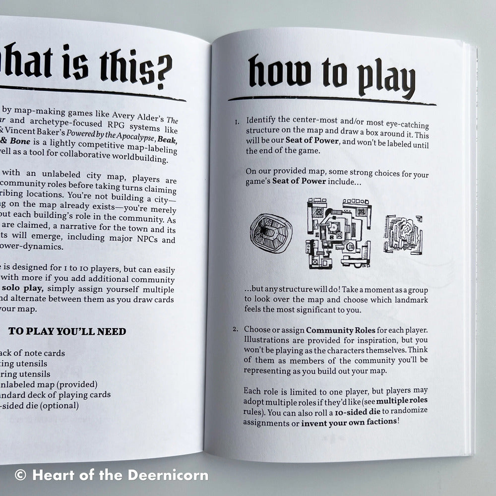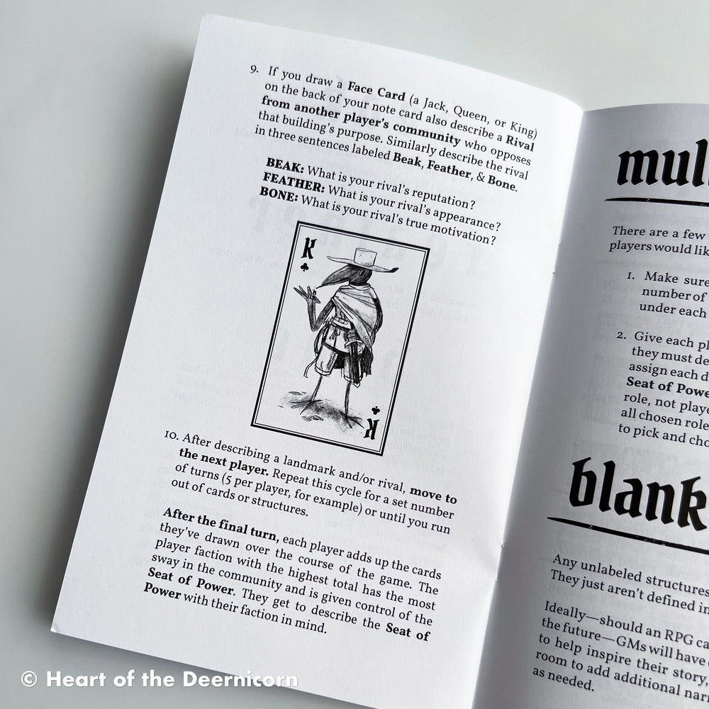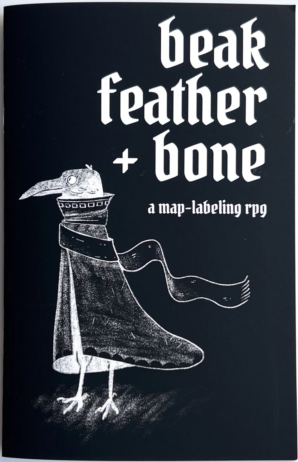 Beak, Feather, & Bone is a collaborative worldbuilding tool as well as a competitive map-labeling RPG. Starting with an unlabeled city map, players are assigned community roles before taking turns claiming and describing locations. Players draw from a standard 52-card deck to determine a building’s purpose and then describe its beak (reputation), feather (appearance), and bone (interior). As buildings are claimed, a narrative for the town and its inhabitants emerges, including major NPCs and shifting power-dynamics.