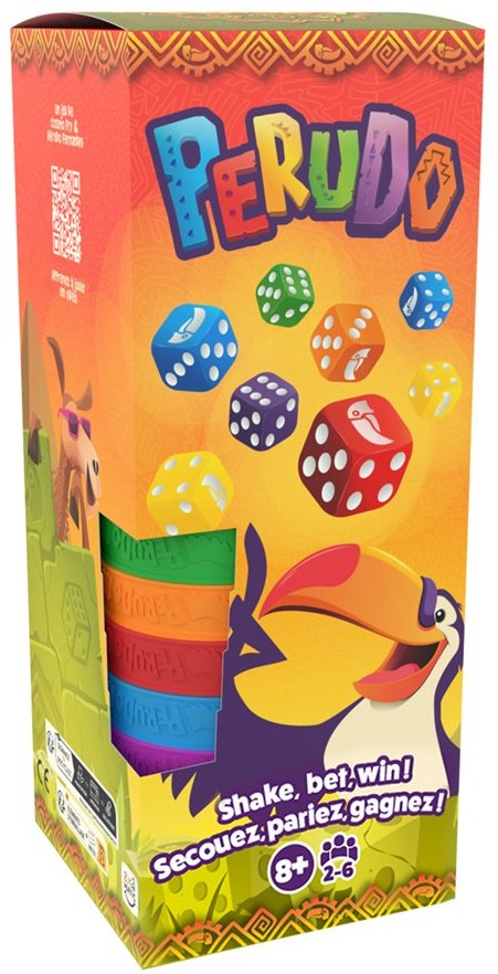 Perudo is a dice game from South America. Each player gets five dice and a cup to roll and hide the dice. Players take turns saying there are more dice with a certain result, like "there are ten sixes." But others can disagree. Then, everyone shows their dice. If you were wrong, you lose dice. The last player with dice wins.