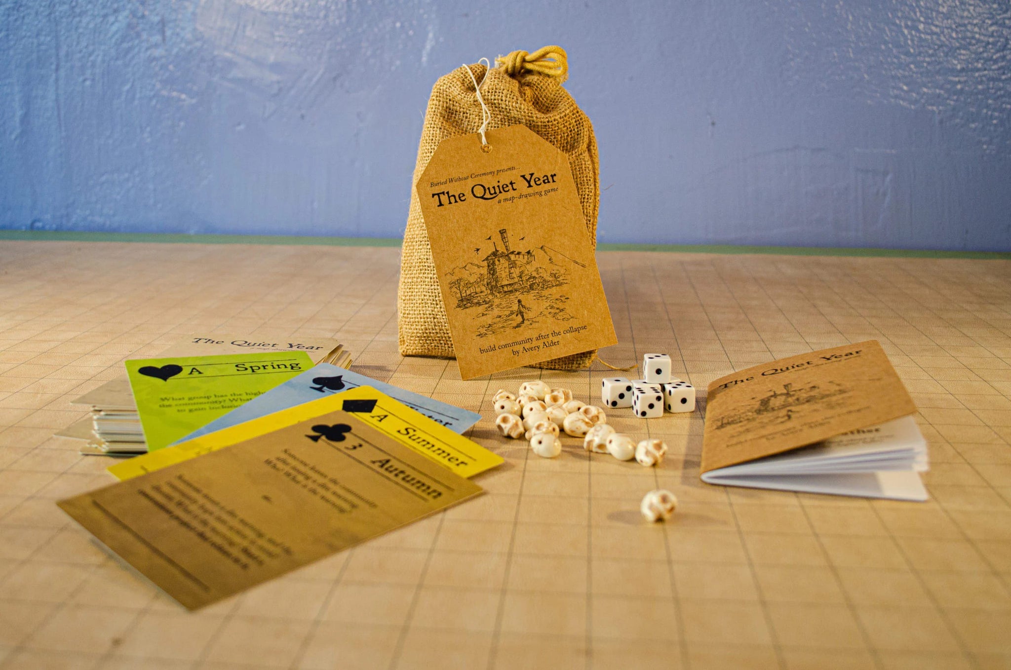 The Quiet year is a map game. You define the struggles of a community living after the collapse of civilization. The 52 cards each correspond to a week of the year and trigger certain events – bringing bad news, good omens, project delays and sudden changes in luck. Your decisions will define the values and future of the community and be added to an evolving collaboratively drawn map. This map blends literal cartography with symbols, creating a rich visual record of land and people.