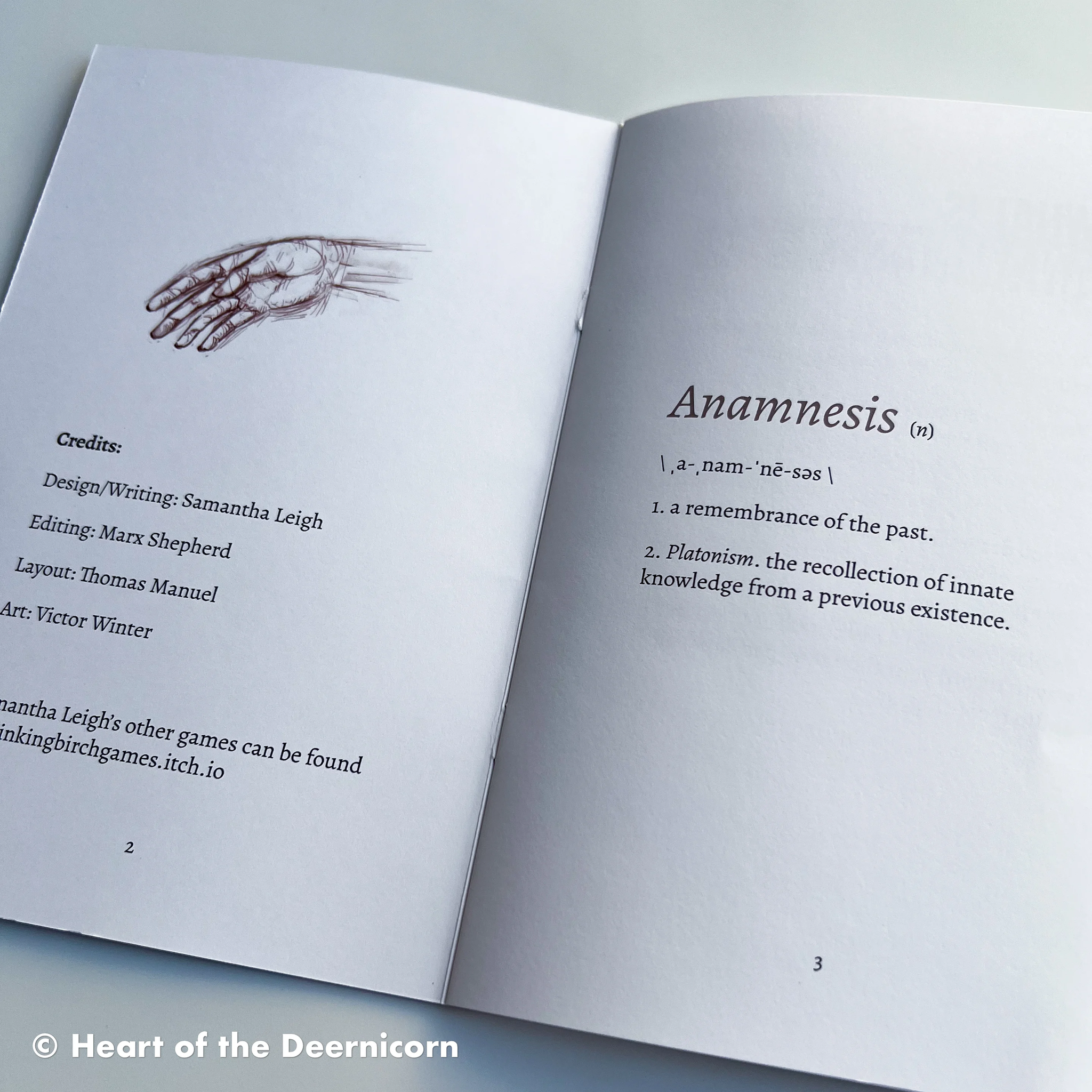 Anamnesis is a solo journaling RPG about self-discovery, reflection, and identity. You play as an individual who has woken up with memory loss. You do not remember who you are, where you are, or what you care about. As you draw tarot cards, you fill the blank spaces of your past and learn more about your present.