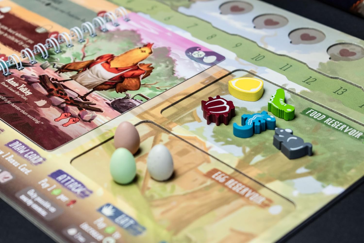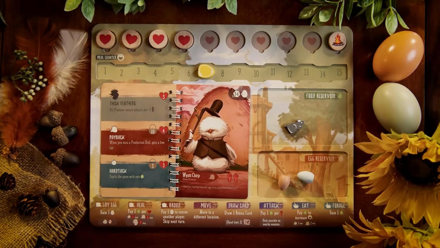 Every turn, players choose their own strategy to progress their cause by selecting two of their eight available actions. Along the way, players will also have to manage leveling up, predator loot drops, traveling grubs, and adverse weather conditions. However, players must plan carefully, because as the seasons change, every predator that is still alive grows stronger and gains new abilities.