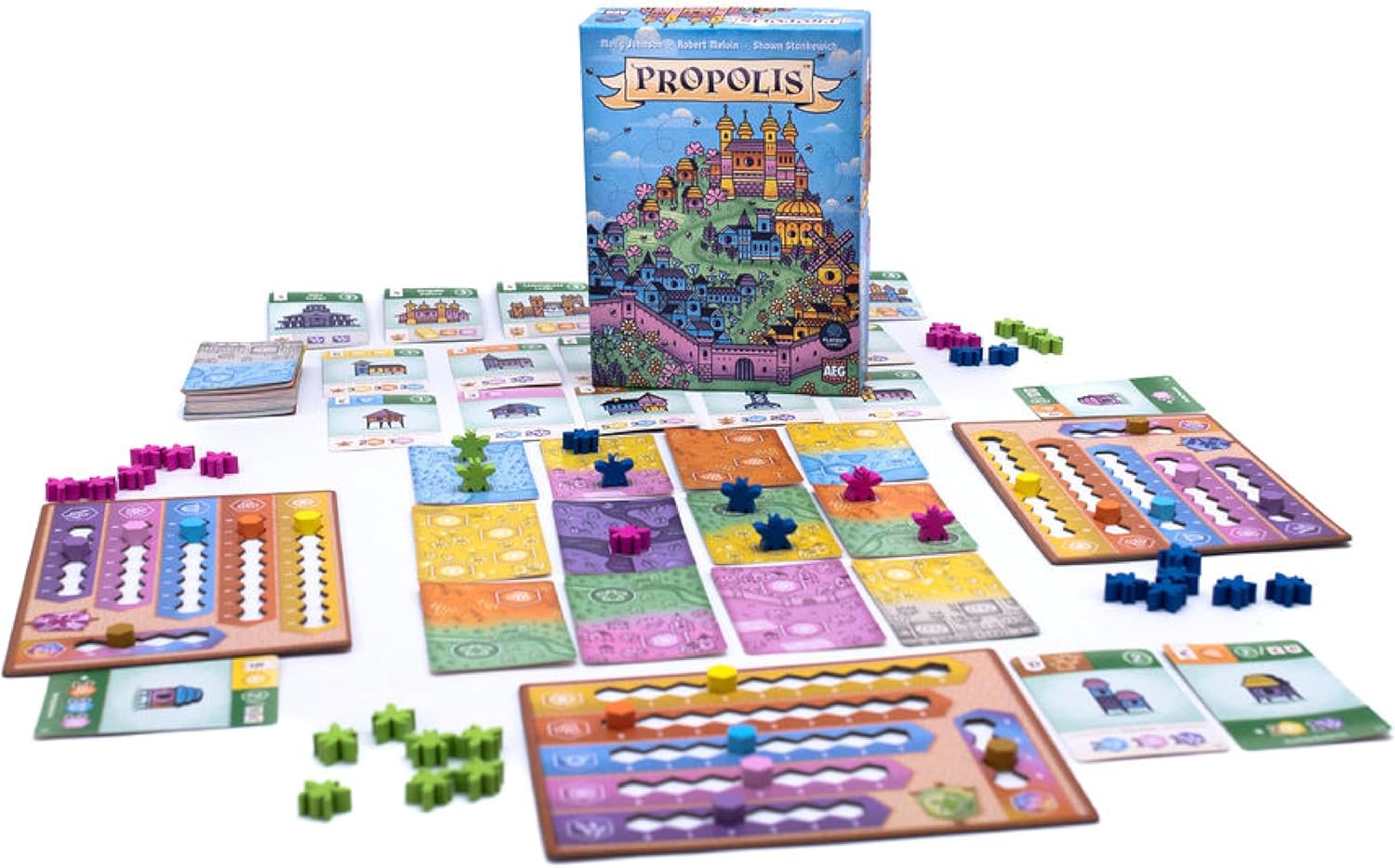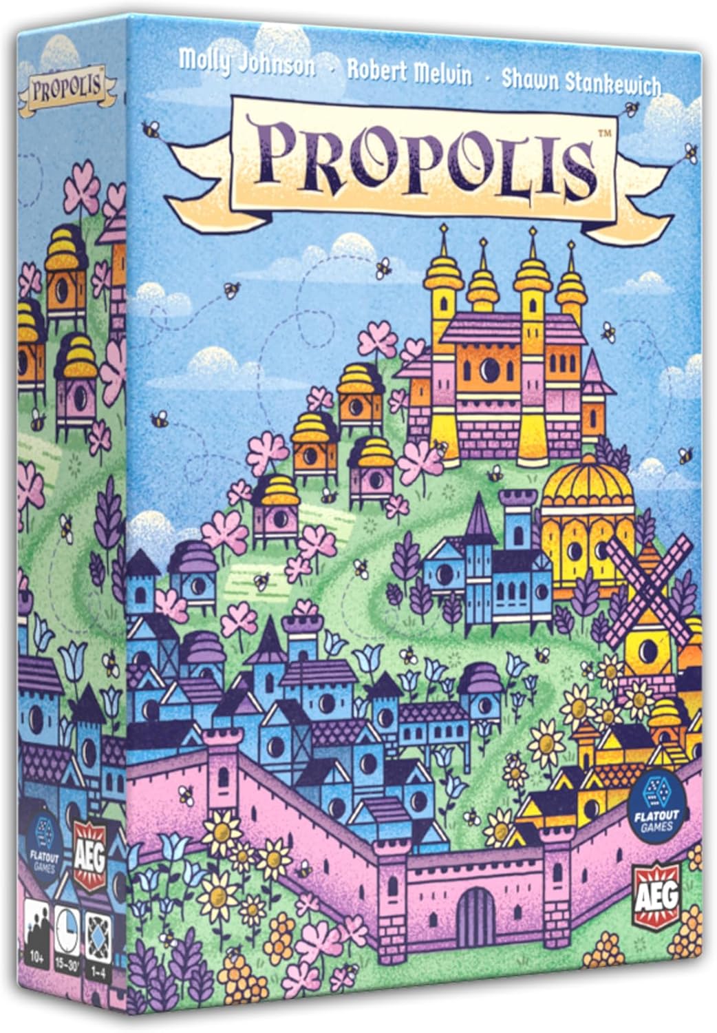 Propolis is a worker placement, engine building, area control, and tableau building game for 1-4 players. Players take on the role of competing medieval bee colonies and take turns deploying worker bees to collect pollen, fortify their positions, and construct their hives to appease their queen and become the most glorious in the land!