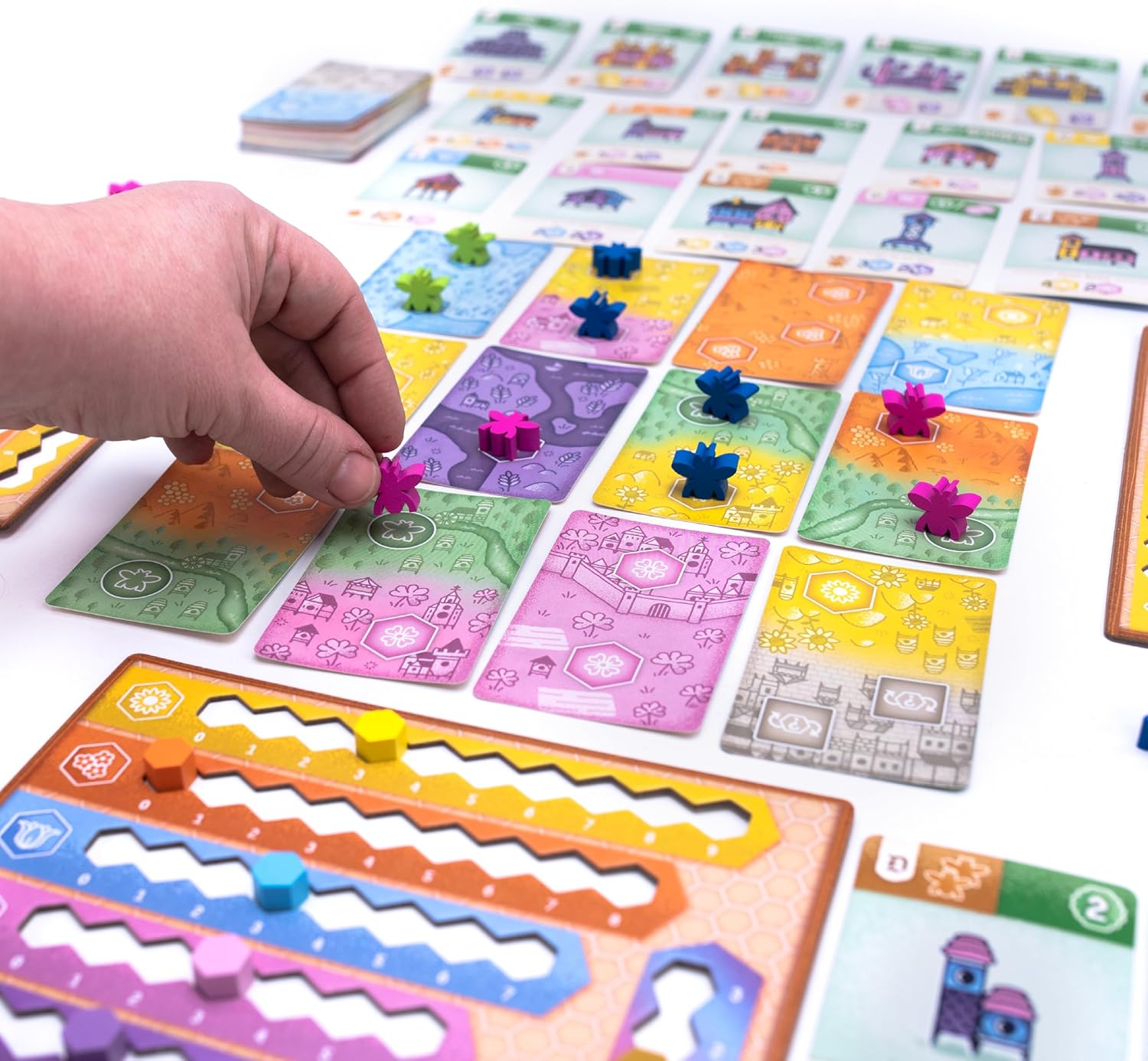 As bees compete over the realm’s floral landscapes, they will be collecting pollen to create the propolis they need to build their hives. Attaining dominance in different realms provides additional glory and building materials. As hives expand, new structures provide additional resources, new scoring opportunities, and the prerequisites to construct a glorious palace for the queen. The player who dominates the realm and builds the most prestigious home wins!