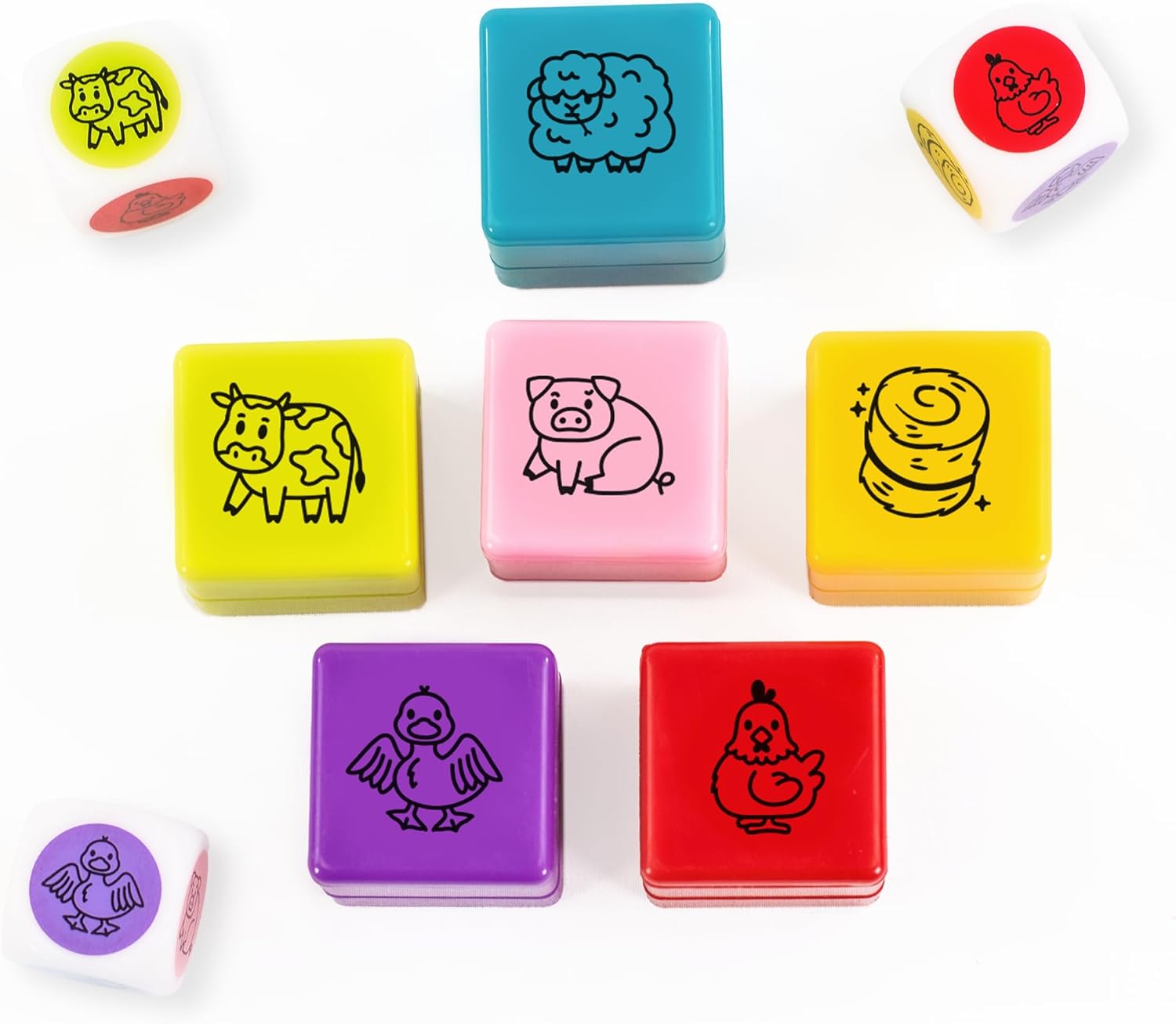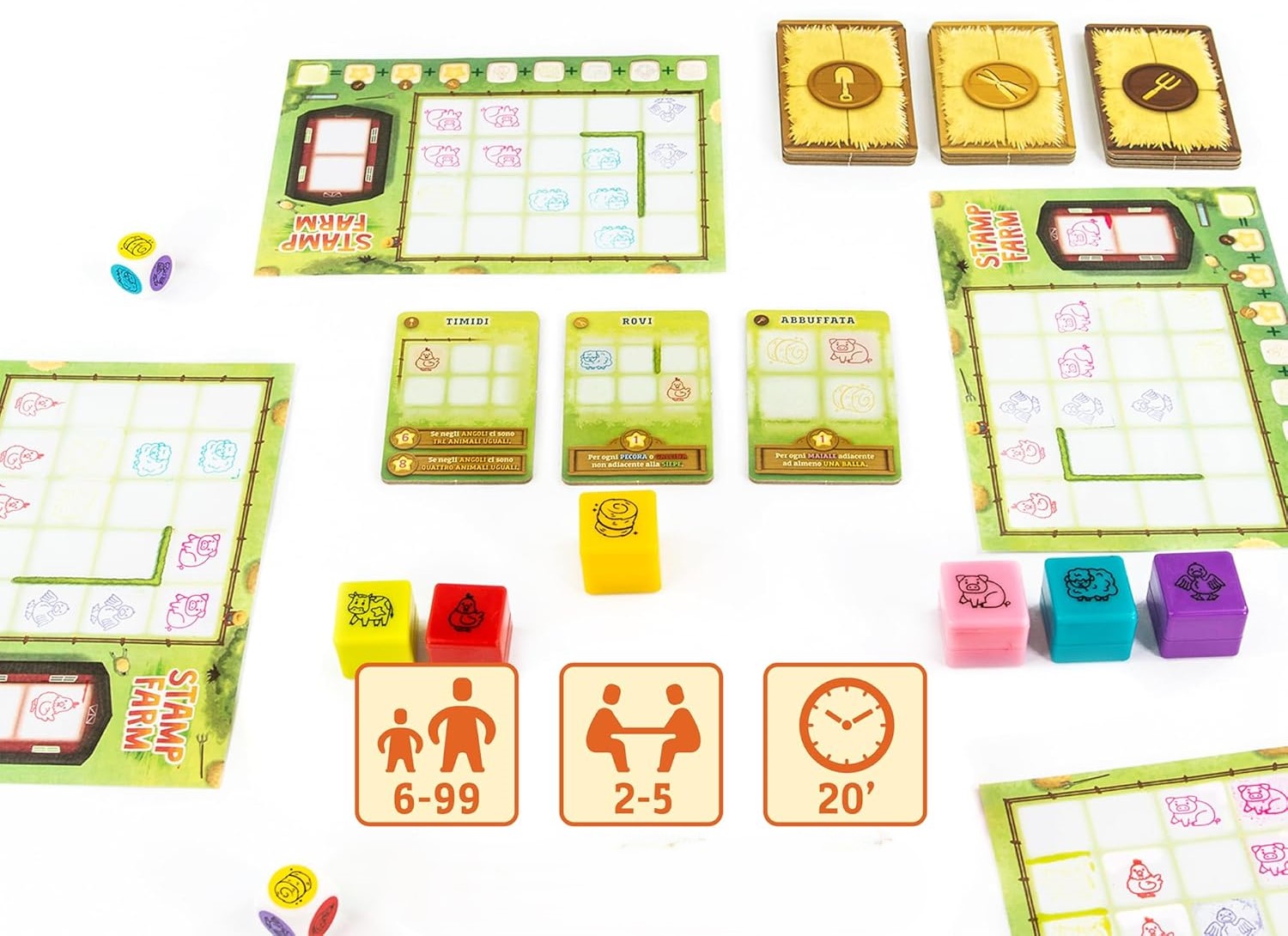Stampfarm is a roll-and-stamp game that includes six colored stamps showing cow, goose, hen, pig, sheep and hay bale.