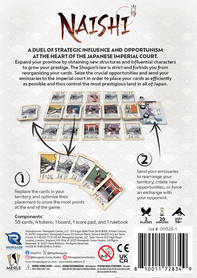 Place Ninja, Ronin, Torii, Rice Fields and the elusive Naishi to create the highest scoring Imperial Court in Japan.