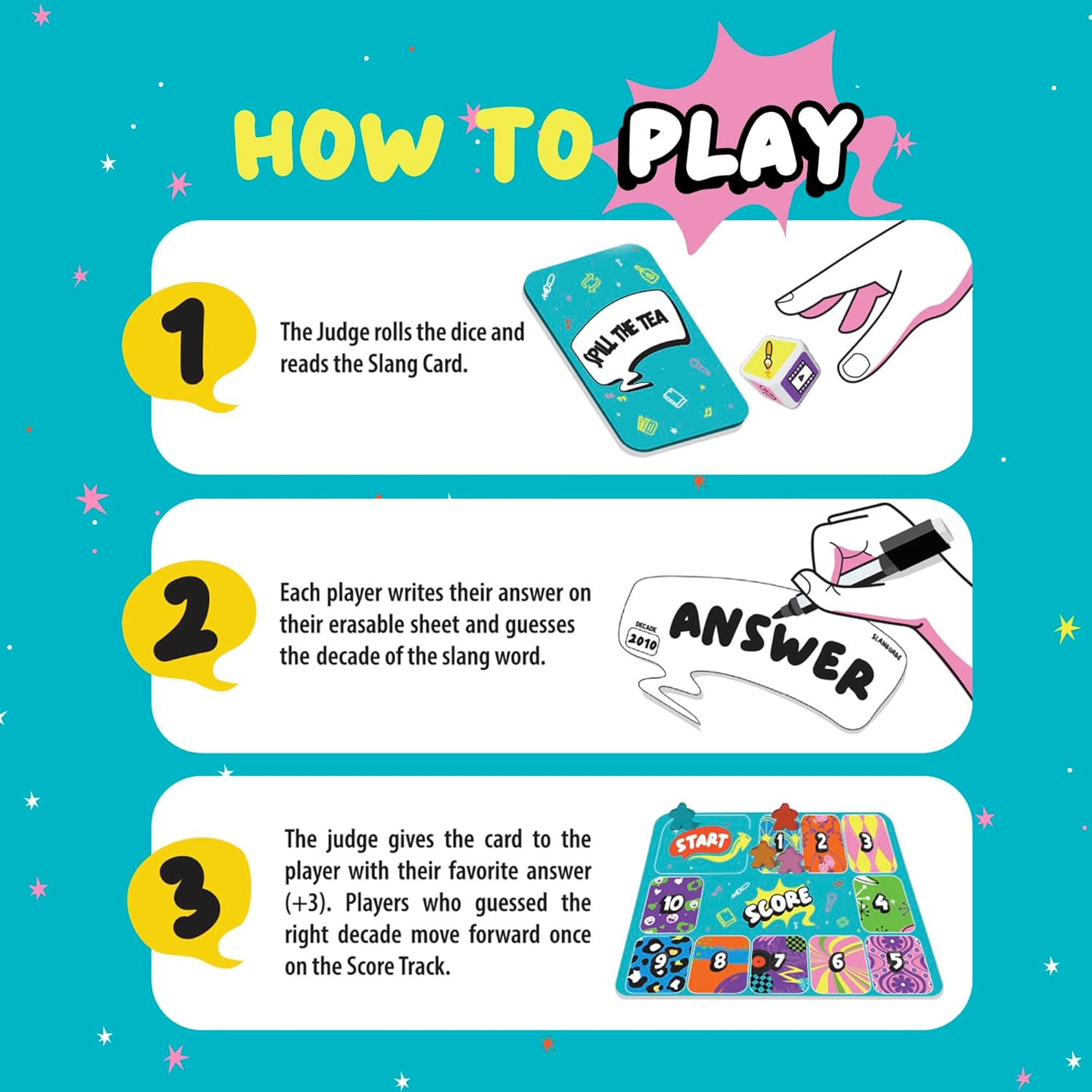 Quick Paced Game: Roll the dice and let the judge pick out a slang card from the slang flashcards deck of our 30 minute game; be creative as you guess the meaning of slang words over the last century to win our fun party and funny family games