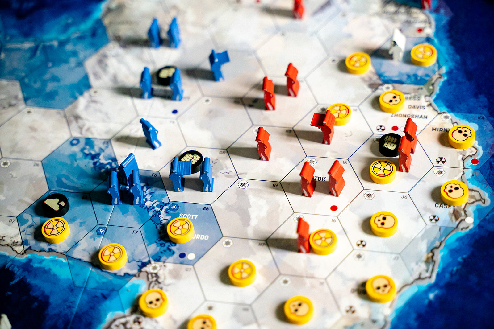 In Meltwater, 2 players command the shattered remains of the superpowers, struggling for control of the ice. Simple diceless mechanics let players displace, corner, and isolate their opponent’s survivors. Here, hunger is a crueler weapon than gunfire, and the barren tundra can only support so many souls. And every turn, radioactive contamination pushes in from the coastline, shrinking the available space and forcing the belligerents closer and closer together.
