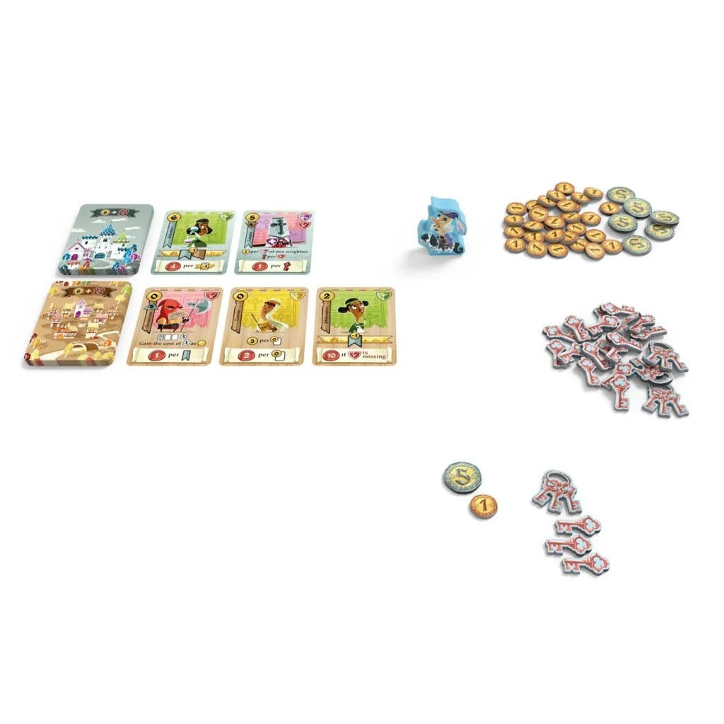 Each player will spend coins to draft 9 cards from 2 open markets on the table (the lower and upper city), creating along the game a 3x3 square of people interacting with each other to trigger instant effects and end-of-game bonuses.