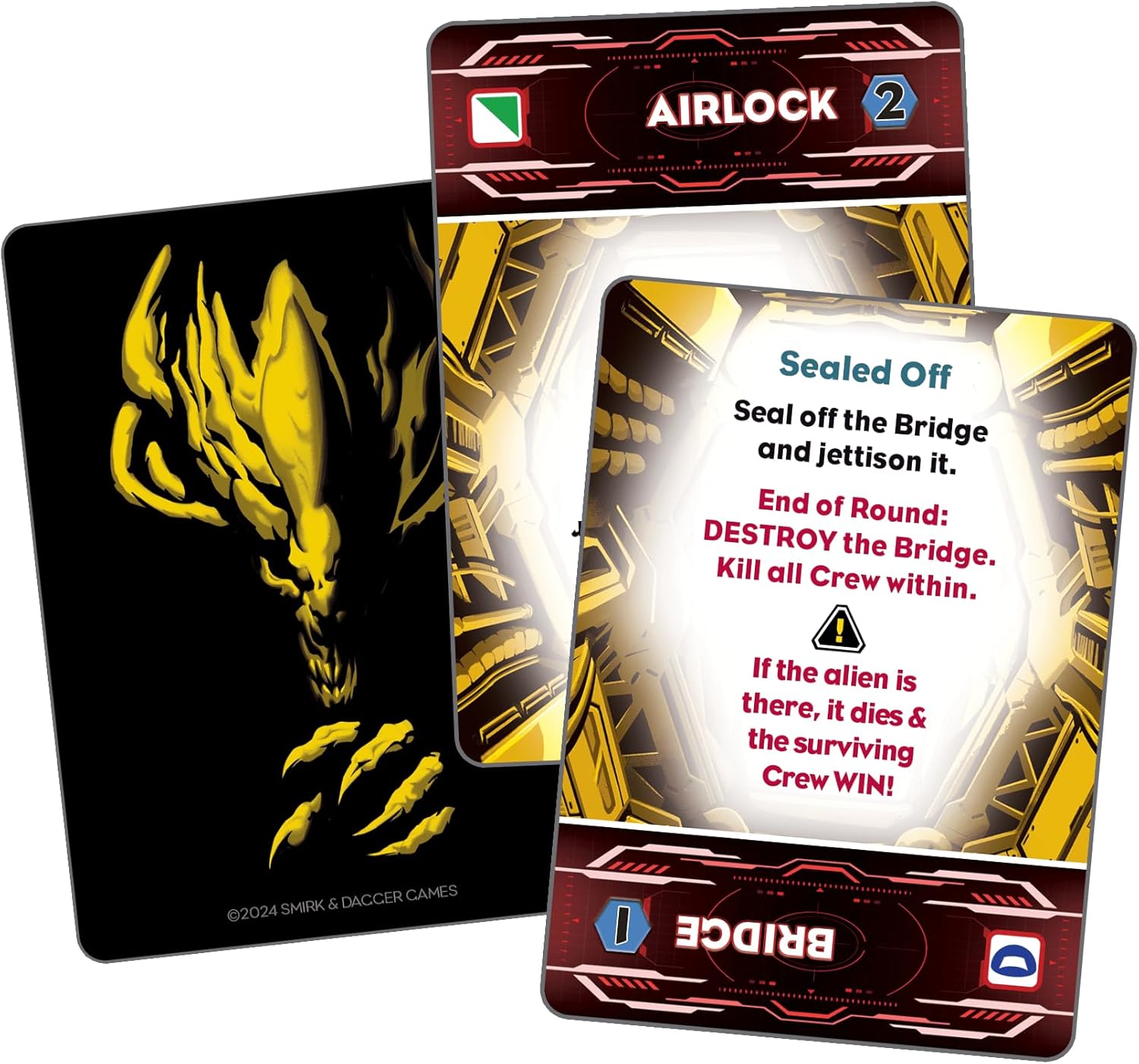 Then the alien's location is revealed. If you share that location and you have the highest priority number, you're dead. If a crew member's action kills you, you're dead. In fact, death comes pretty quickly in this game — then ten minutes later, you are all jumping back in to play again. With a bit of skill and luck, however, you may be able to isolate the alien at one of the locations that let you jettison it into space, along with any fellow crew members who happen to be there.