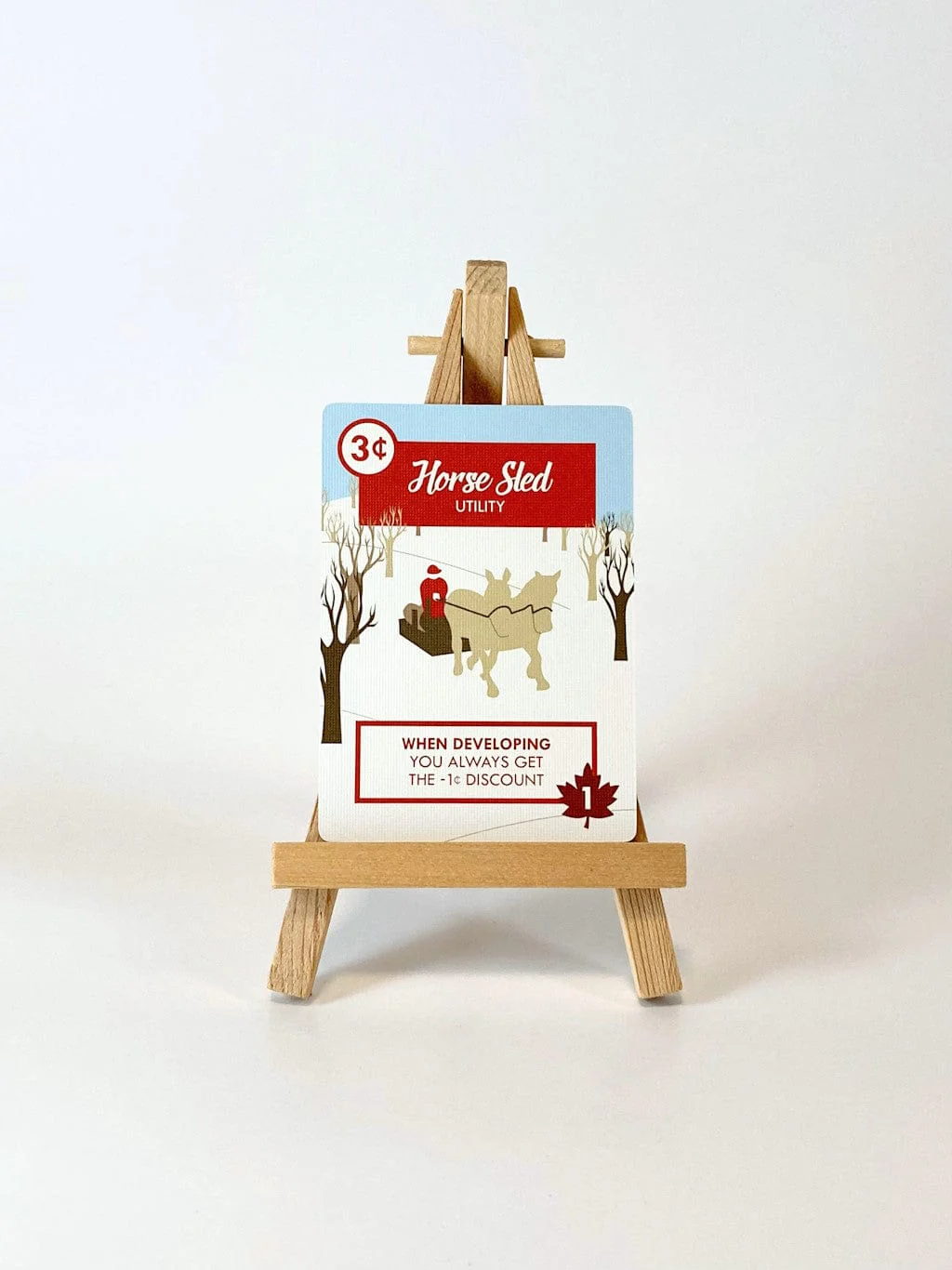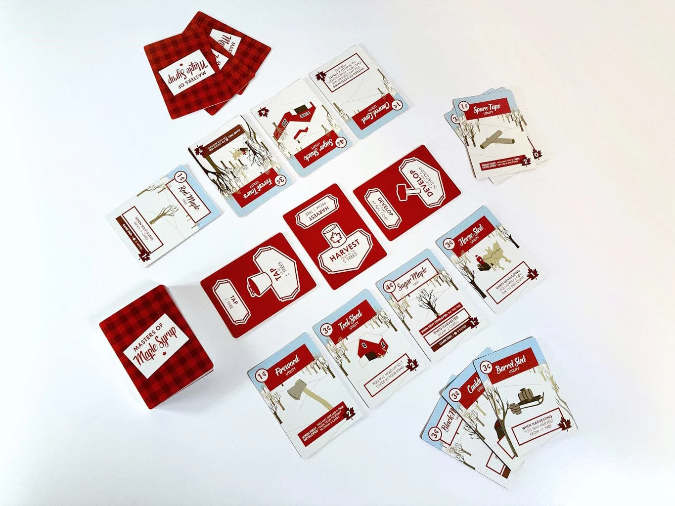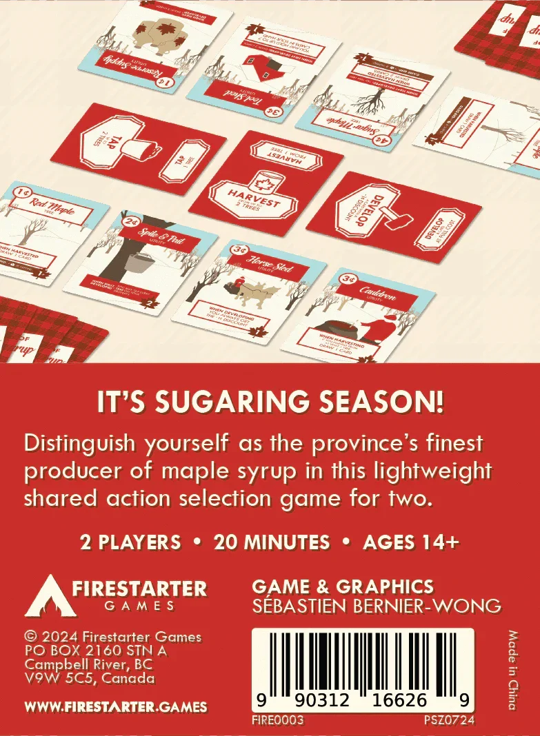 Players will develop their property tableaus by adding trees to harvest sap from and utilities to improve their syrup production. On their turn, the active player determines the action both players will take, with a slight advantage in their favour.