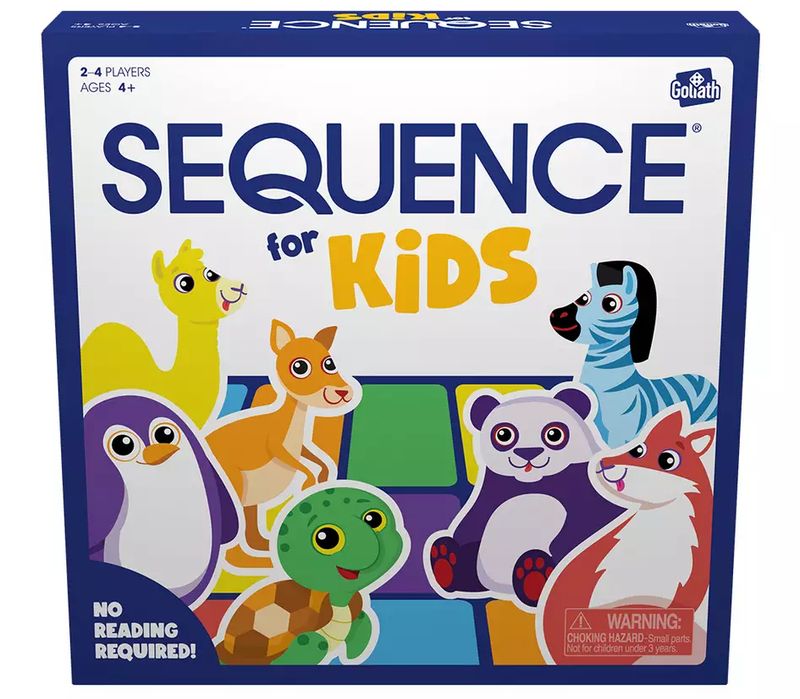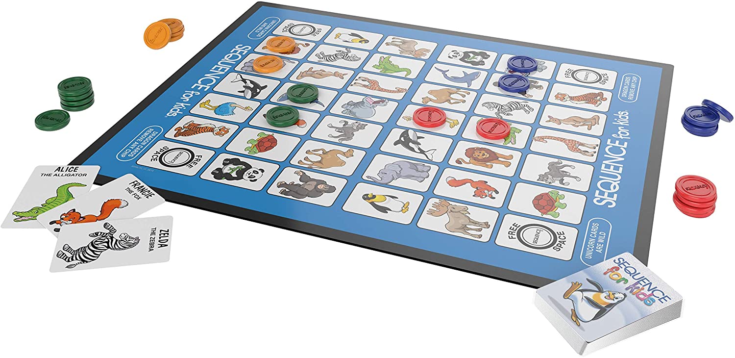 It's the classic game of SEQUENCE made just for kids! Play an animal card from your hand, and place your chip on the corresponding animal on the board. Wild cards add excitement to the game - use a unicorn card to place your chip anywhere, or use a dragon card to remove an opponent's chip. The first player with four chips in a row wins! This exciting strategy game helps develop logical thinking skills.