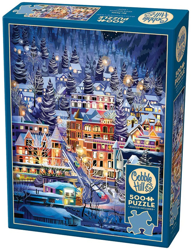 Dale Hitchcox is a Canadian artist who says, “My work is meant to evoke emotion. I’m inspired by the drama of nature – the skies, the light and sense of movement.” In this 500 piece puzzle, Ski Town, we feel a sense of a relaxing night after a long day on the slopes. Freshly fallen snow emits a crispness in the air. The dark purple mountain frames the puzzle adding drama to the scene that draws you into the glowing center of the town.