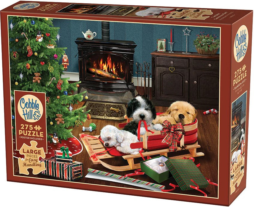 The Best Christmas Gift is waiting to be discovered on Christmas morning by the tree. Adorable dogs are nestled in their red sled awaiting the children to come downstairs for their surprise. A warm fireplace is keeping them nice and toasty in their new home.