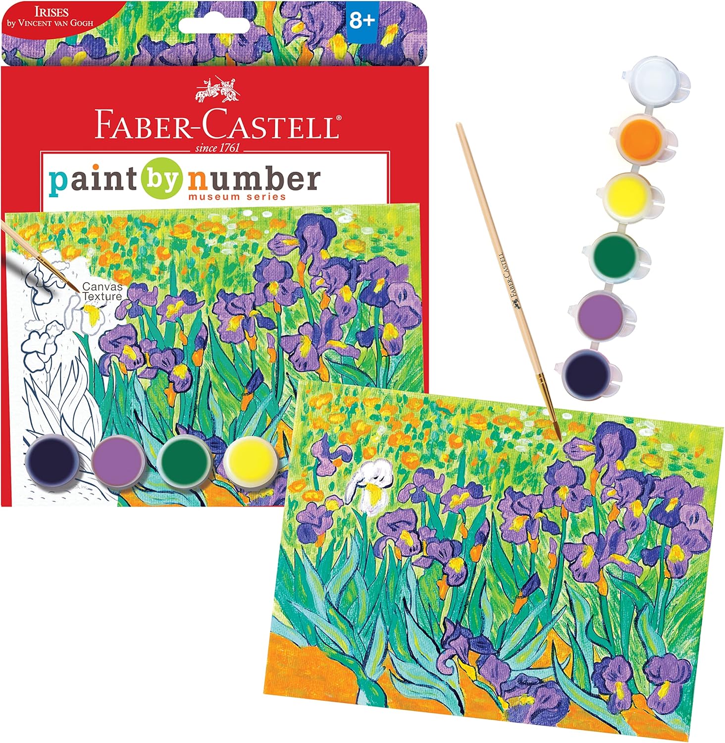 Contents Include: Six 5ml acrylic paint pots- white, purple, dark blue, yellow, green, and orange, #2 brush with Faber logo, Real Canvas board- 6x8" with 1 color printing, hang tab, display easel, number guide and instructions with interesting facts about the art.