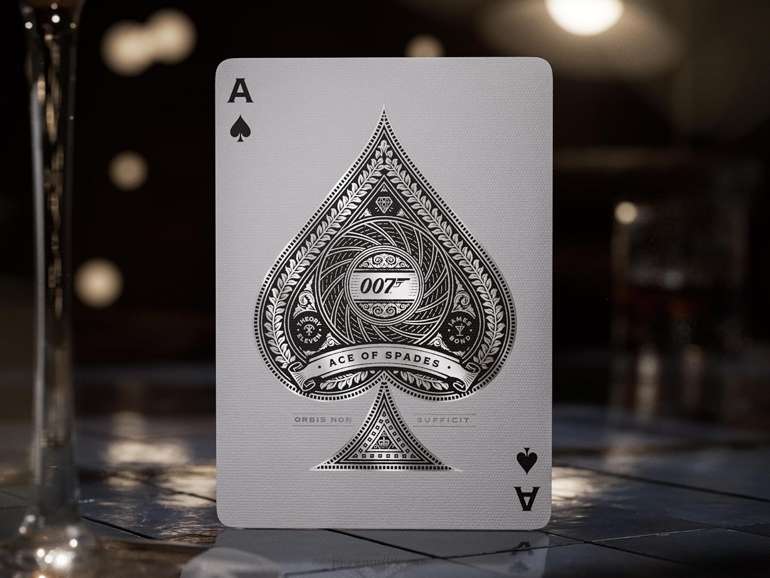 COMPLETELY CUSTOM ARTWORK: The finest, opulent silver foil with tactile embossing on each box. Striking gunmetal silver foil on every card within. Featuring completely custom artwork in every aspect of the design, with the Ace of Spades, Joker, box design, and court cards inspired by iconic Bond films, gadgets, and weapons over the past six decades.