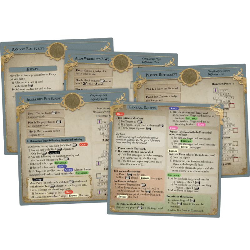 In Pax Illuminaten, players assume the role of an Areopagus, a top ranking disciple of Adam Weishaupt's Order of the Illuminati. You are tasked with accomplishing a series of recruitment plots to extend the reach of the order and grow its web of sympathizers. Players will compete with each other to gain influence over this growing membership in a bid to accomplish Weishaupt's designs ahead of their rivals and become the highest ranked among the Areopagites.