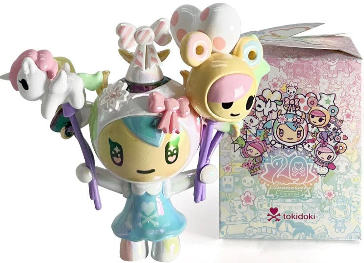 Celebrate 20 years of tokidoki with our 20th Anniversary Blind Box! This series features iconic characters reimagined in party-ready designs, including Donutella, Nijiko, Mozzarella, Adios, Mermicorno, and more—plus a special chaser, Party Bubbly! Join the celebration of two decades of signature artwork, unforgettable characters, and kawaii culture with this must-have blind box collection for every tokidoki fan!