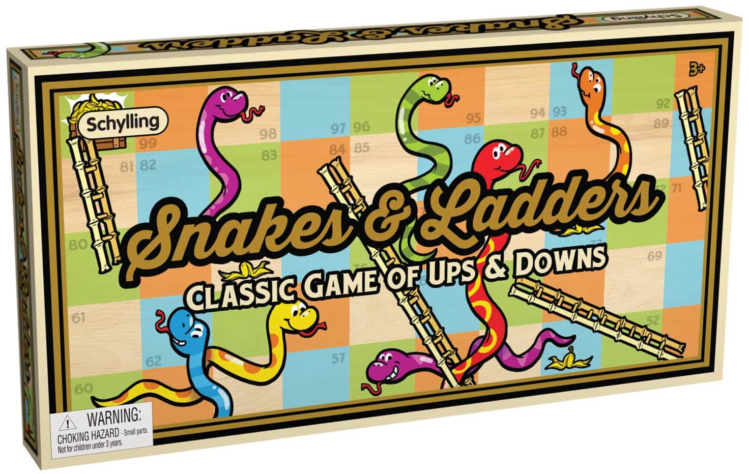 Schylling’s Snakes & Ladders is a classic game offered in the Schylling collection. Be the first player to reach the highest space on the board by moving up and across the spaces and taking advantage of the ladders to extend your move. But look out for those snakes which can hinder your progress! This fun race game features retro-inspired packaging and a faux leather textured game board backing to bring a classy vintage feel. The instructions printed on the inside of the box so there is no risk of losing them! For ages 3+ and 2-6 players. Make game night a blast with the classic game from Snakes & Ladders from Schylling!