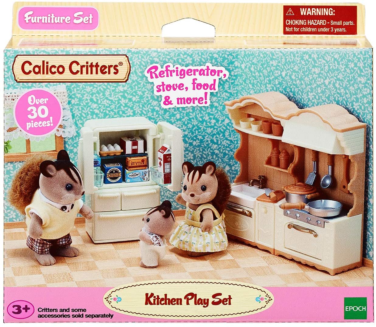 Kitchen play set includes a double-door, three-drawer refrigerator, stove unit, and sink unit. Includes cooking utensils, ingredients, and other small accessories. Kitchen play set features cooking utensils that can be stored in the kitchen cabinet and drawers. The refrigerator contains a freezer compartment, from which ice can be taken out using the provided scoop.