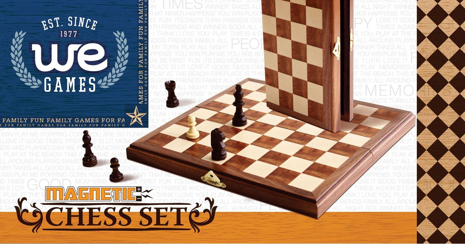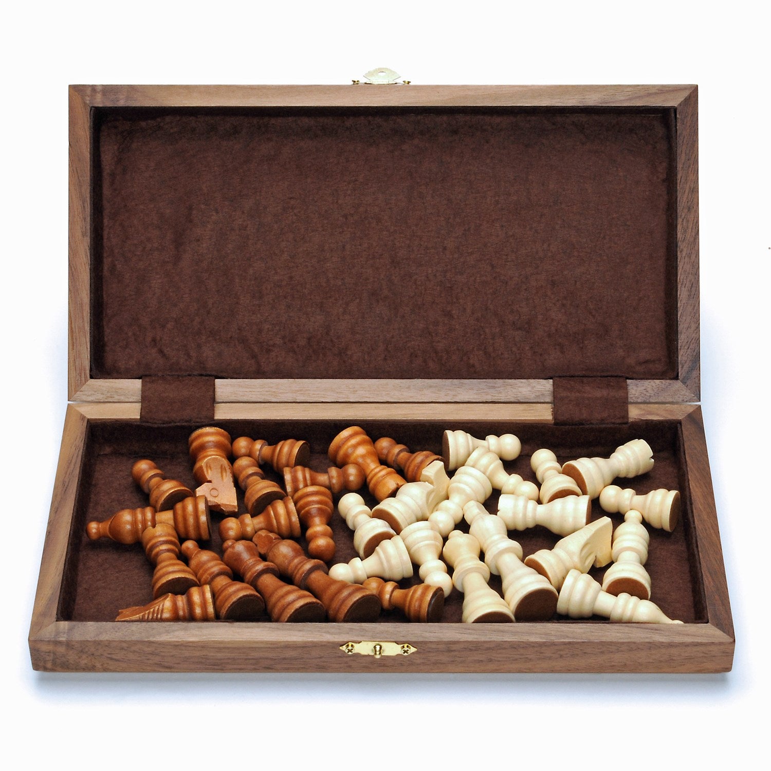 Enjoy one of the world’s most cherished games on the go! This set contains a walnut and natural wood veneer chess board, lined in brown billard style felt and 32 chessmen in light and dark wood stains. The board measures 10.5 in. with 1.25 in. squares and the King is 2.625 in. tall.