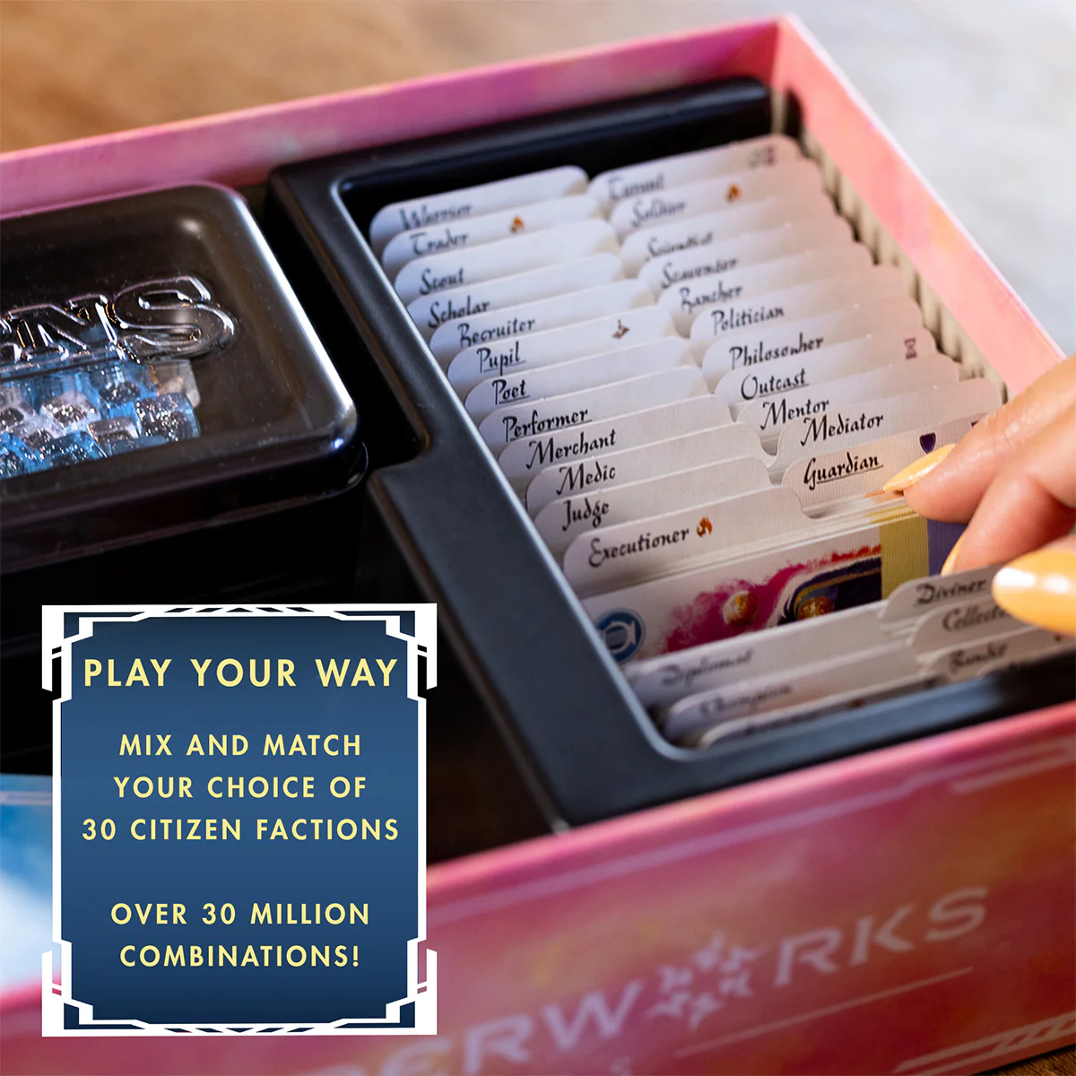 Recruit multiple citizens on your turn by selecting an available group of cards, placing them in your city tableau and grouping like citizens together to grow their action’s strength. Then, select one citizen type in your tableau to activate, taking the effect of the card and discarding it from your city. But keep watch of rival cities, because when you activate a citizen, all players who have the same type can follow your action and activate a matching citizen of their own!