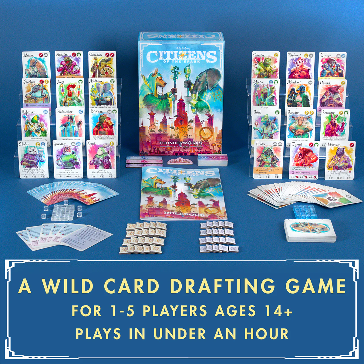 Citizens of the Spark is a variable setup card game where players take turns attracting citizens, taking actions, and claiming sparks. The more citizen cards a player has of a specific type, the more powerful that citizen’s action becomes. The player with the most sparks in their city when the deck runs out is the winner!
