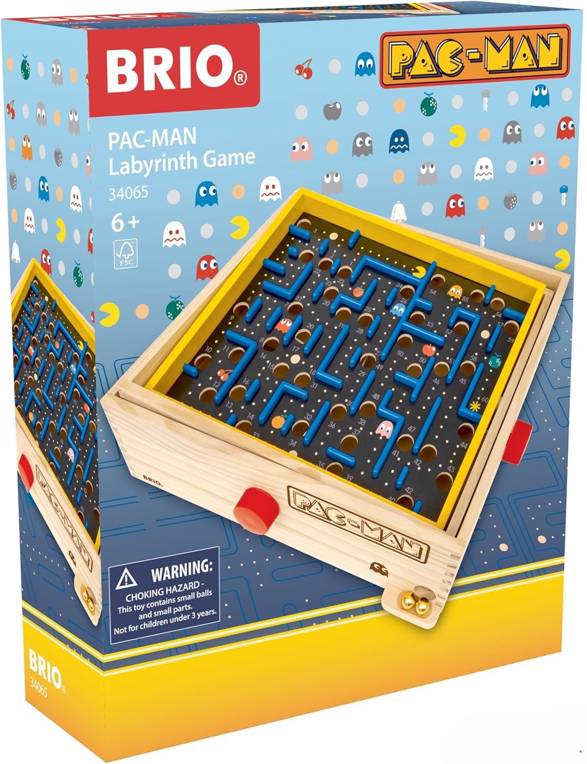 Who will master the Pac-Man Labyrinth? This retro-style labyrinth takes players back to the 1980s, the heyday of arcade video games. The board is navigated using buttons, and the goal is to eat Pac-Dots and avoid ghosts while making your way through the wooden maze. With this homage to one of the most popular video games of all time, childhood memories can come alive again. About Brio Games: Our games are designed to develop fine motor skills, concentration, and hand-eye coordination. By playing and training these skills, we can all enhance our quality of life while having fun. All our games feature a timeless design and offer clear and simple Scandinavian functions that are not only great to play but also look fantastic. And everyone can join in – our games are not just for children. They provide great fun for friends and the whole family at any age. The Pac-Man Labyrinth game includes: 1 x Pac-Man Labyrinth, 2 x metal balls.