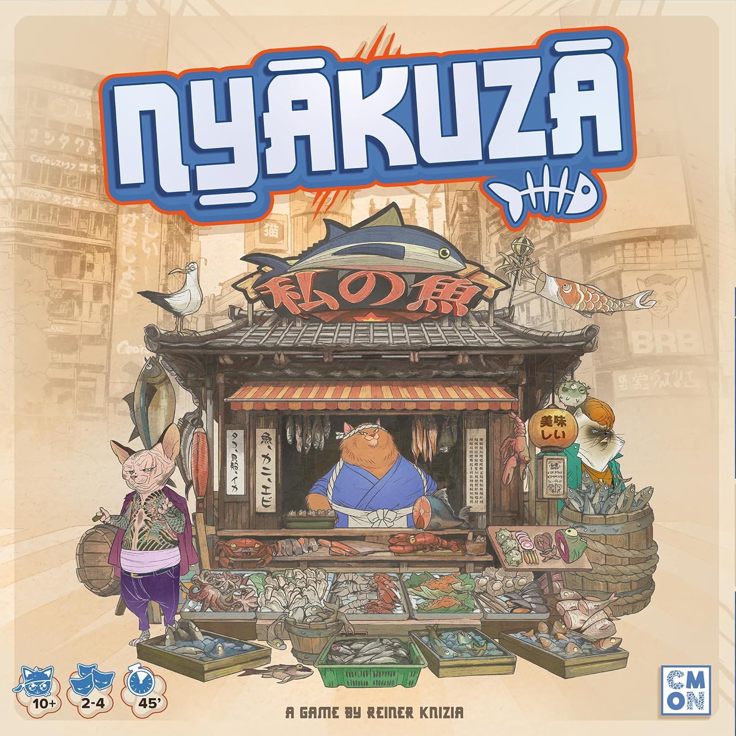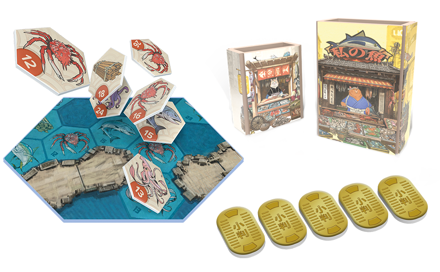 In Nyakuza, players take their place as the head of their respective Nyazuka clan. They will bid for boats to go out and net the freshest catch in the bay, using it to set up their seafood Stalls. Each player is racing to build the Grand Market Stall first to prove that they are the best clan and win the game.