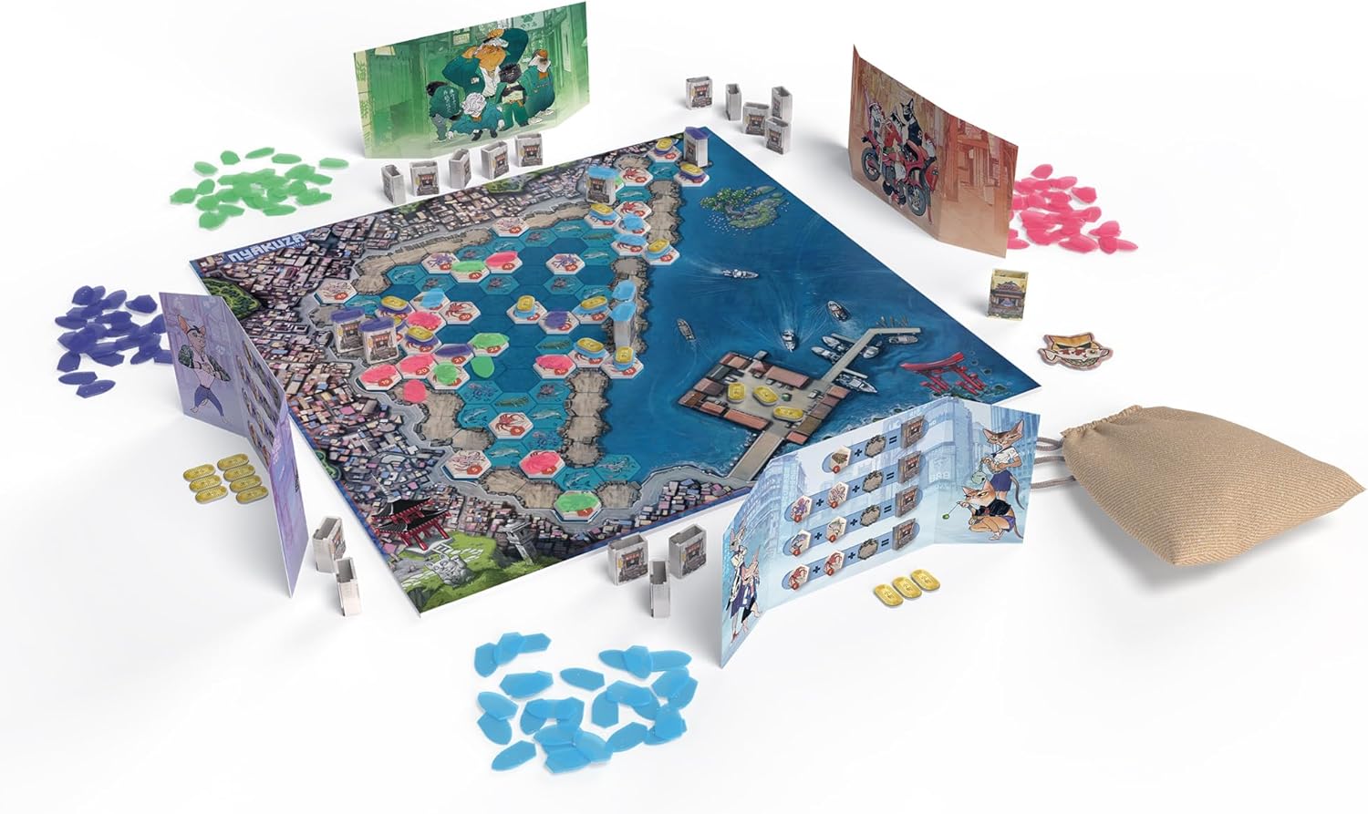 VIBRANT & ENGAGING THEME: Dive into the colorful world of Nyakuza, where cunning strategy, resource management, and clever bidding are key to becoming the best clan in town.