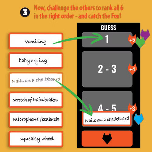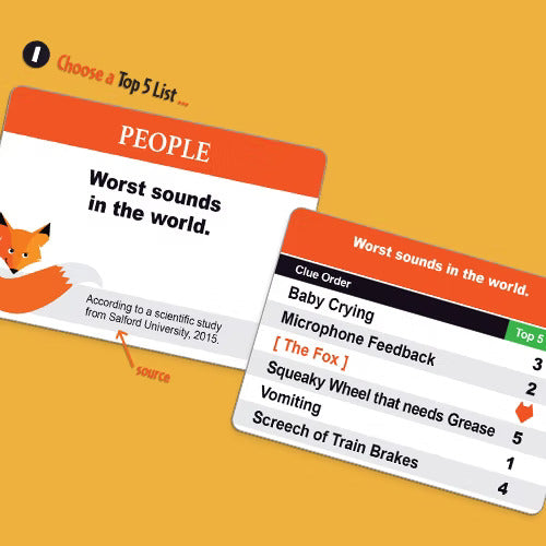 In OUTFOX THE FOX players team up to debate and sequence the order of top 5 lists, but each round, one player inserts a fake answer (THE FOX) among the 5 real ones. It’s like trivia night, but you are given ALL the answers. You and your crew just need to put them in the right order and catch THE FOX in a lie!