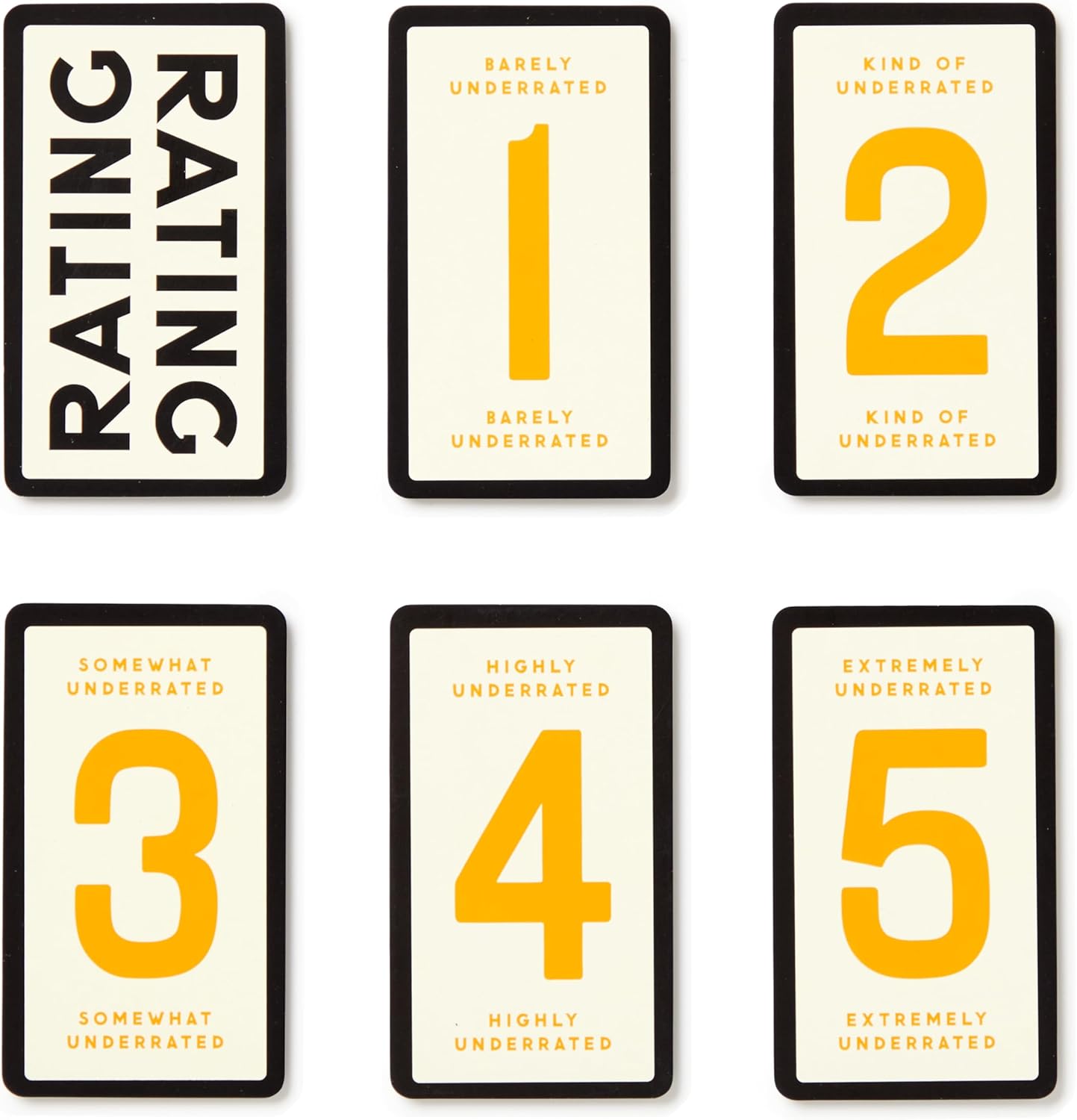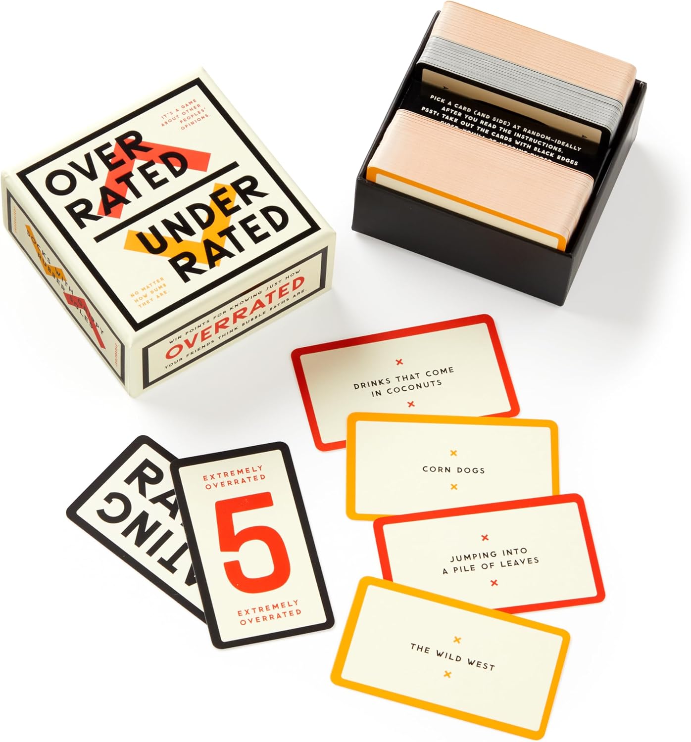 HOW TO PLAY - You’ll win points for guessing just how under or overrated players think an item is–and then argue about how wrong they are. Includes 200 double-sided cards with 400 prompts like ‘The Beatles,‘ ‘Drinks that come in a Coconut,’ and ‘Avocado Toast,’