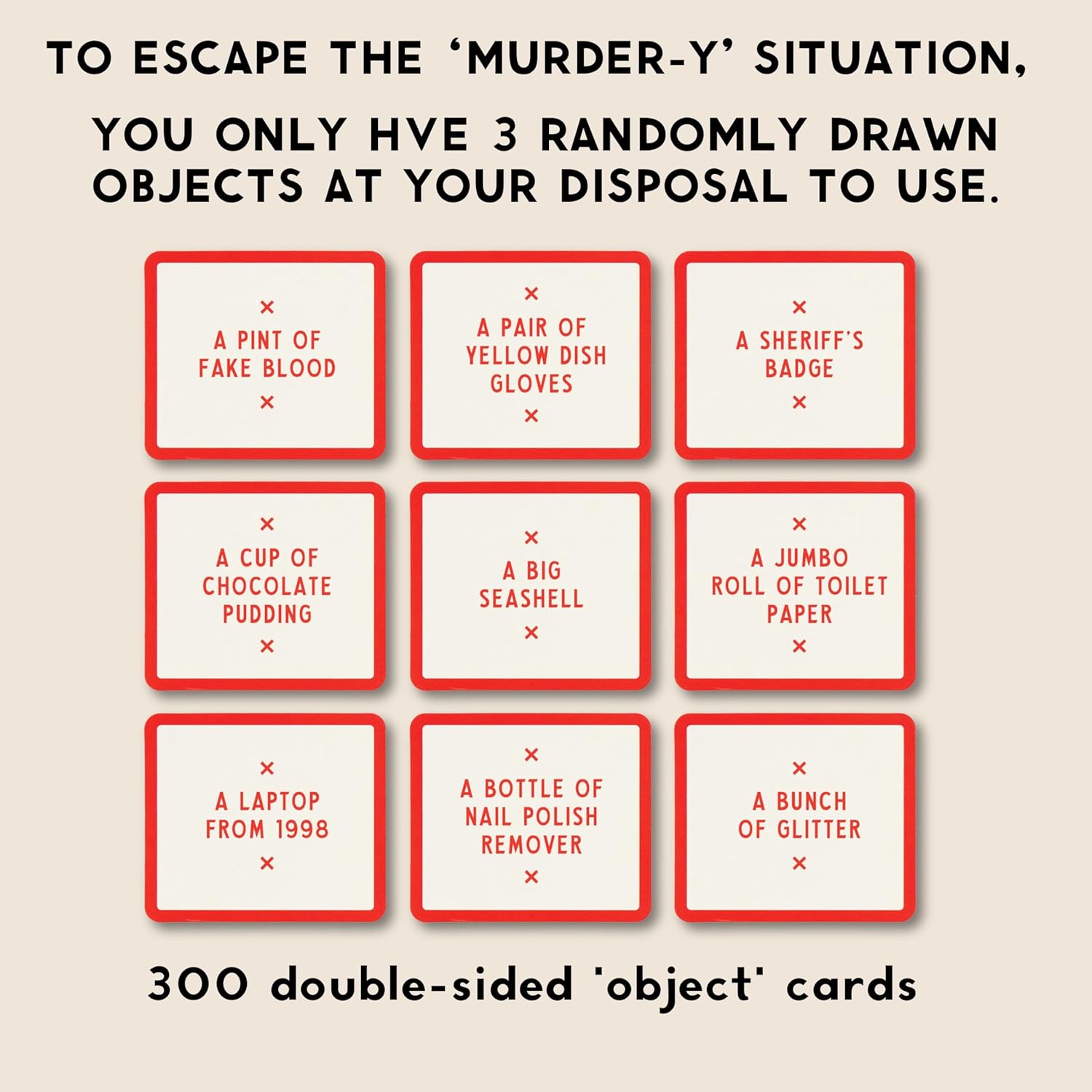 Includes 300 double-sided ‘object’ cards and 50 double-sided murder-y ‘scenario’ cards