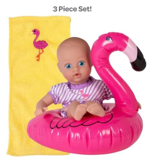 Fun water play is even better with Adora's SplashTime Baby Tot Fun Flamingo! This 3-piece set Adora doll comes with an ADORAbly cute 8.5-inch pretty little doll that can suck its thumb and has a cuddly baby powder scented body, plus a trendy blow up floatie. Fun Flamingo is your little one's next best companion for splish-splash in beach, pool, lake and even bath time, every time!